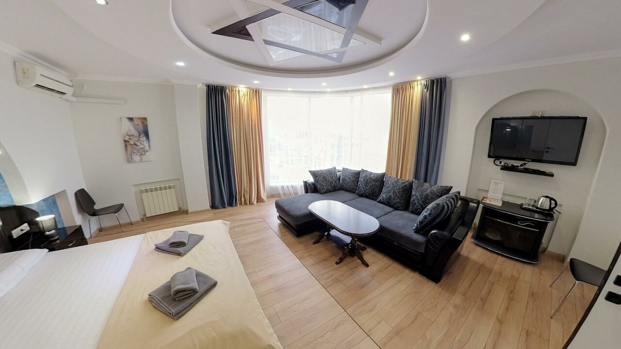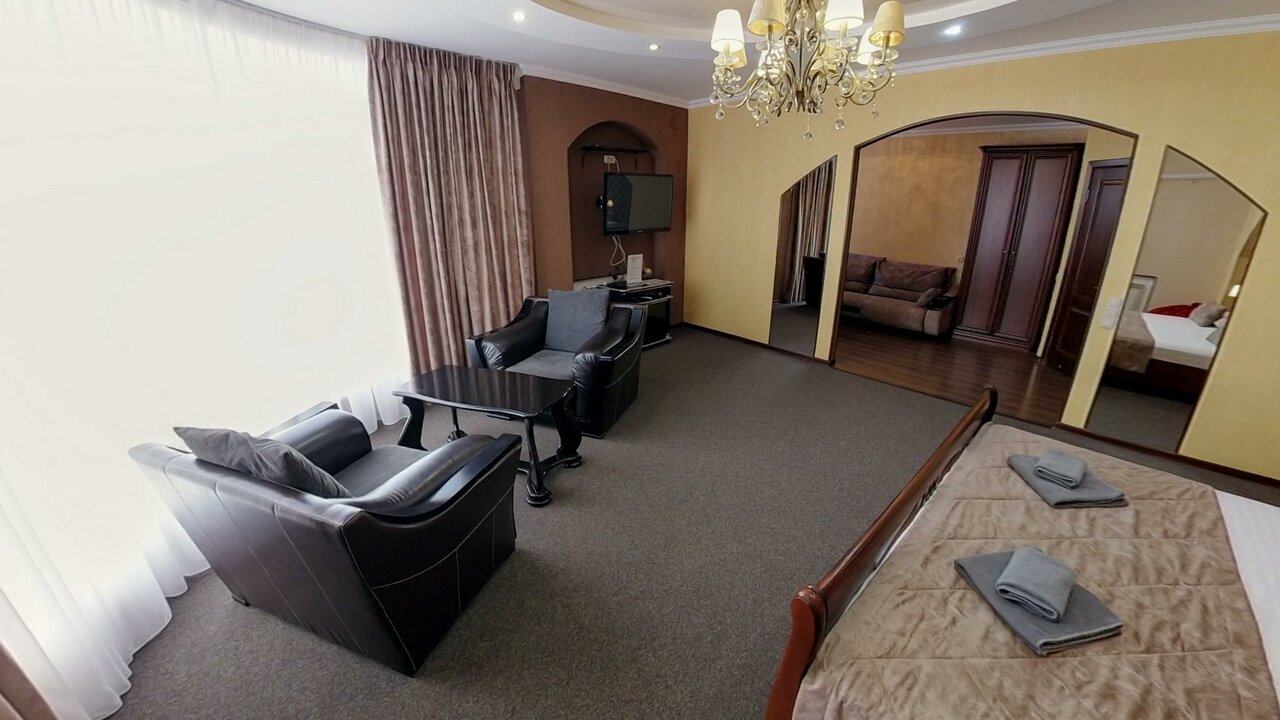 Люкс площадью 50 кв.м с видом на город.Подходит для размещения 4 человек. Имеет спальню с приятным интерьером.В номере: 1 двуспальная кровать и 1 диван двуспальный.Имеется телевизор, кондиционер, отопление, шкаф, вешалка, зеркало, комод, прикр...