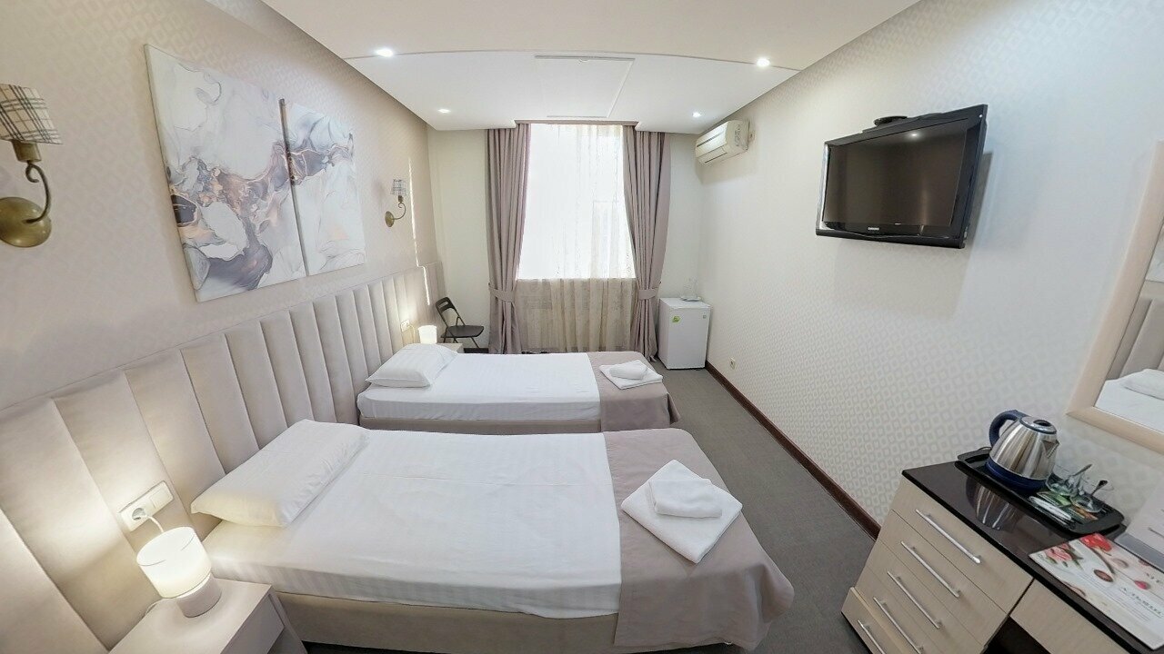 Двухместный стандартный номер с 2 отдельными кроватями площадью 20 кв.м с видом на город.Подходит для размещения 2 человек. Имеет спальню с приятным интерьером.В номере: 2 односпальные кровати.Имеется телевизор, кондиционер, отопление, шкаф, ...