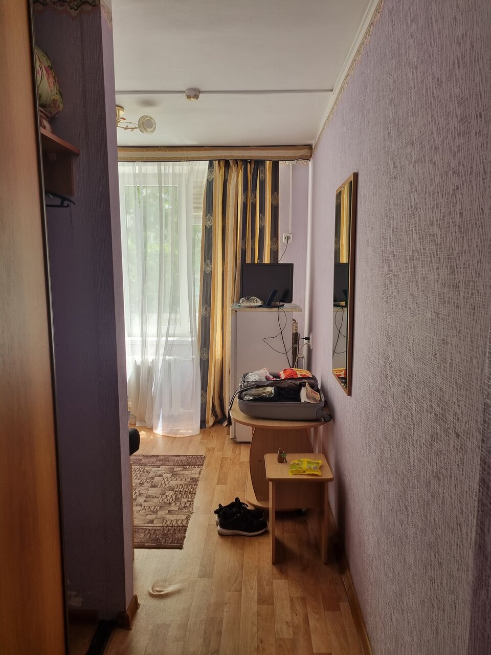 Попала в 80 годы. Очень уставшая мебель, старенький холодильник, телевизор из 90, который не поймал ни одного канала, не понятно, зачем он там находится. В санузел без слез не войти. Но, один большой плюс, кафе на 2 этаже, где довольно был вкусный завтрак и сытный ужин.