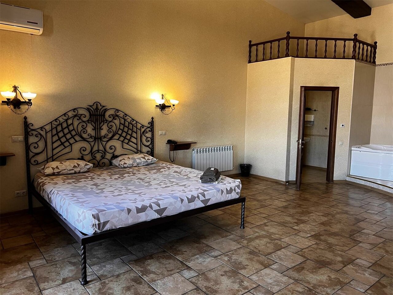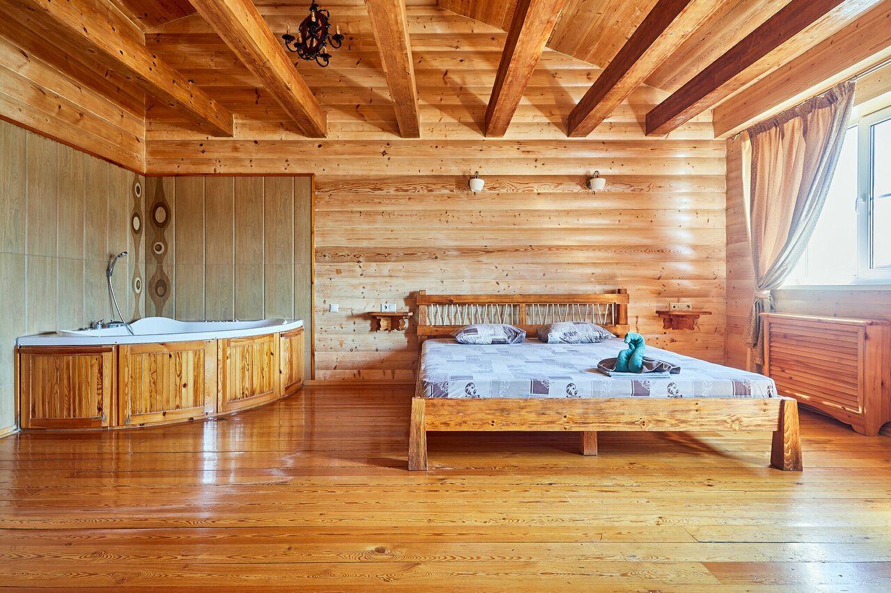 Номер в стиле деревянного сруба с джакузи.