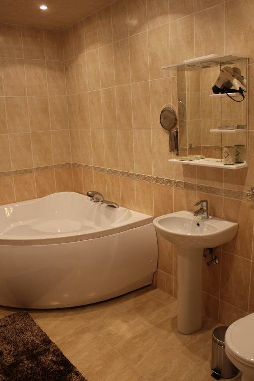 - Парковка рядом (хоть и небольшая).; Уютная и стильная обстановка.; Доступность общественного транспорта.; Чистота в номерах.; В некоторых номерах – большая ванна.