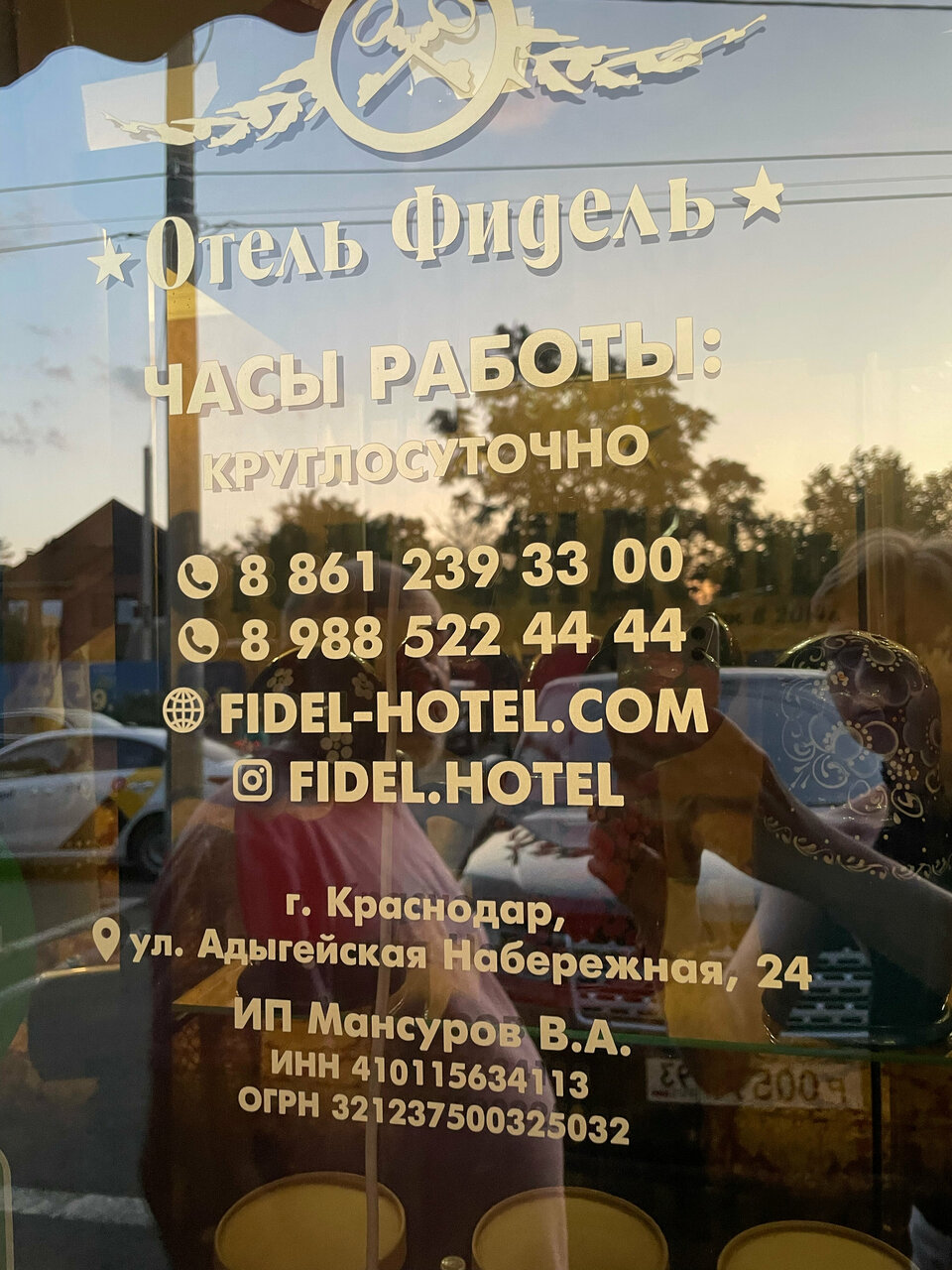 Заезд — с 14:00, выезд — до 12:00. Связь: сайт http://fidel-hotel.com/, телефоны: +7 (988) 522-44-44, +7 (961) 239-33-00, +7 (861) 239-33-00.