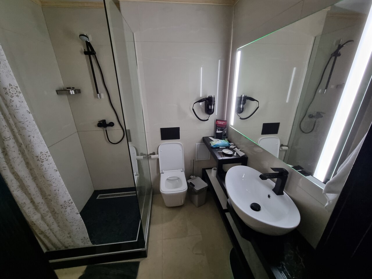 Отличные просторные номера, с балконом, отличный интерьер, оформление впечатляет. Круглосуточная стойка регистрации; Вся сантехника просто блестит. Туалетные пренадлежности, полотенца, халаты — все есть. Парковка небольшая, но удобная, есть место зарядки для Теслы