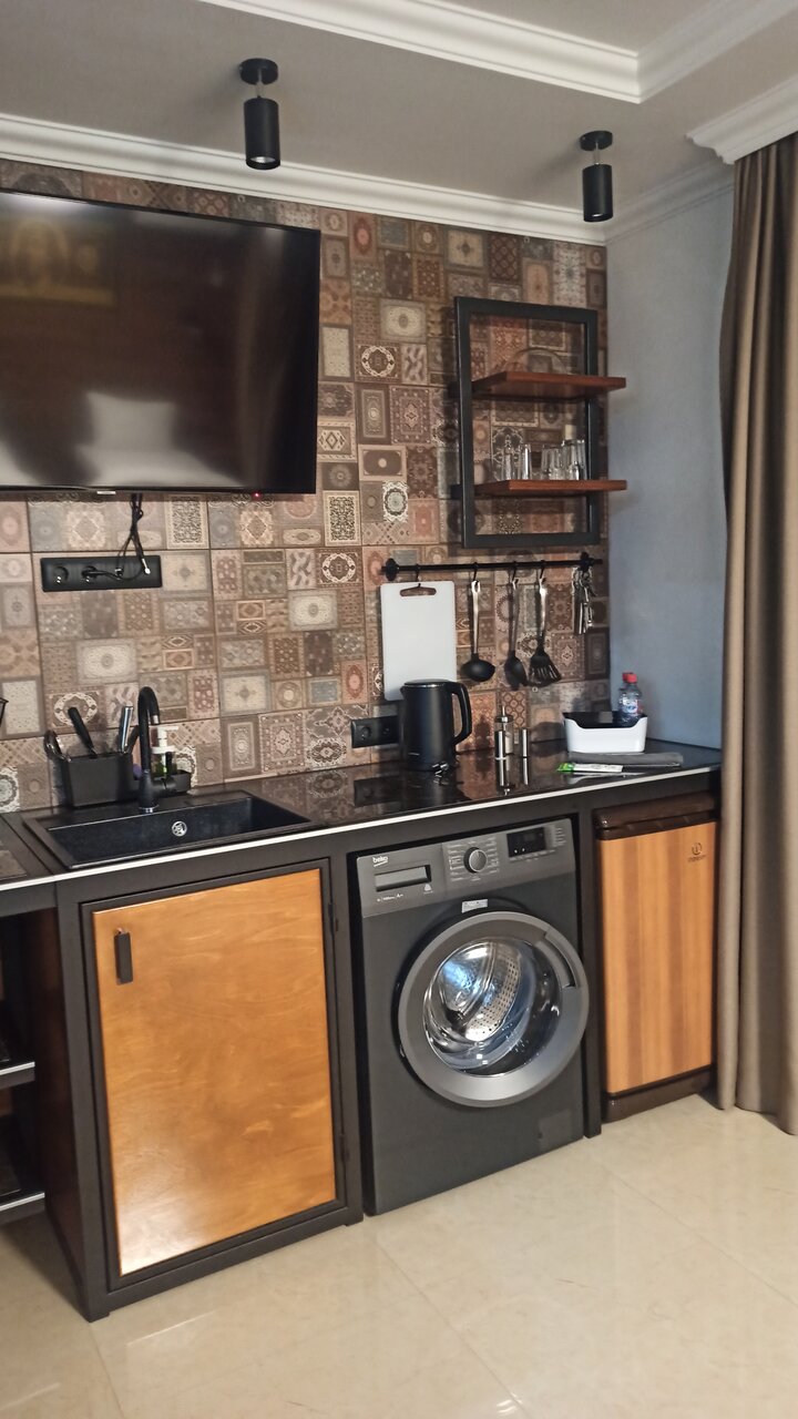 Отличный отель. Редко такие попадаются. Останавливались на одну ночь , по дороге в Сочи. В каждом номере есть кухня, если уезжаешь рано, тогда можешь приготовить себе завтрак. Из плюсов нужно отметить современную отделку номеров. Все необходимое есть, вплоть до тапочек. В десяти минутах ходьбы есть продуктовые магазины.