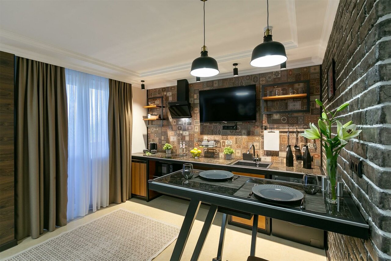 - Наличие кухни в номерах.