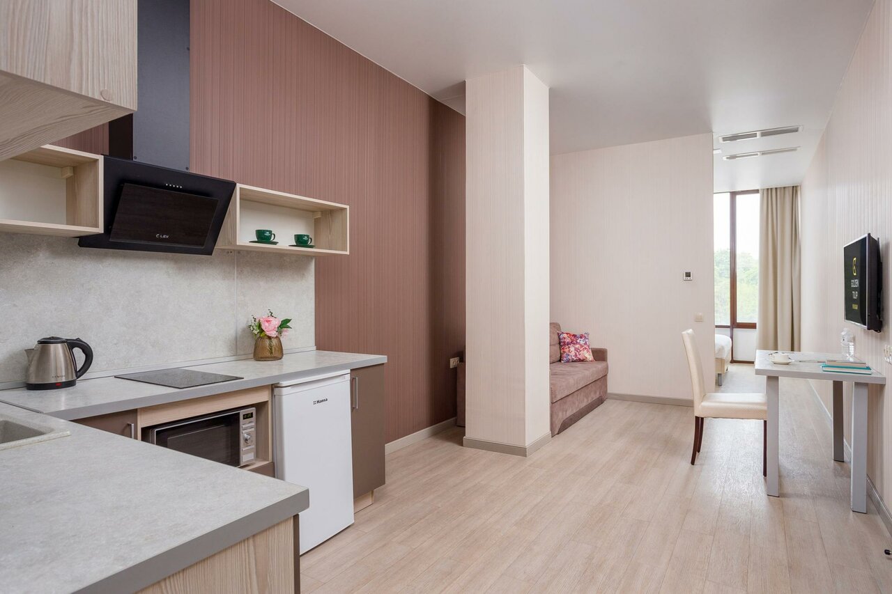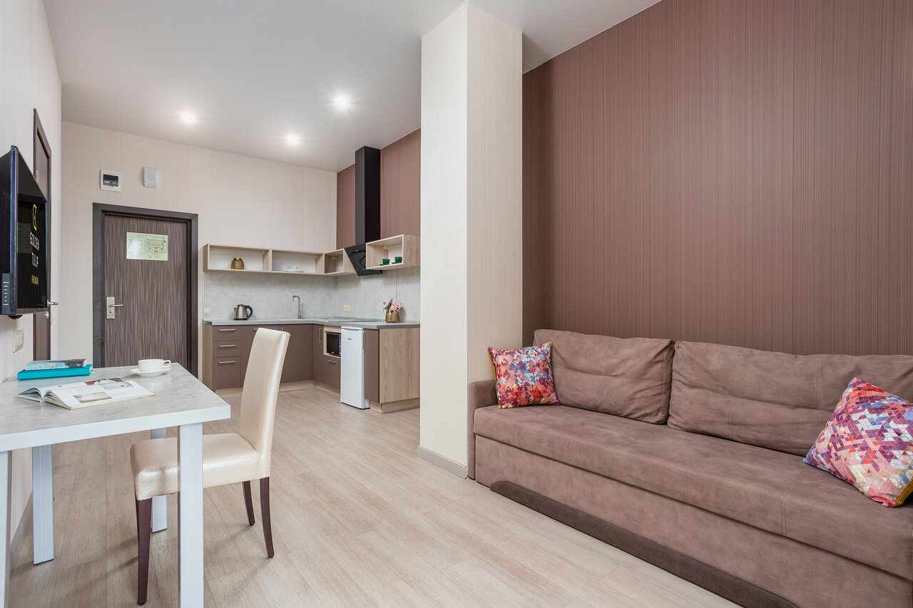 Окунитесь в атмосферу домашнего уюта в улучшенных апартаментах. В номерах представлены: 1 двуспальная кровать с комфортным матрасом бренда Askona, высококачественный текстиль от бренда Togas, диван, рабочая зона, набор для приготовления чая и кофе. В