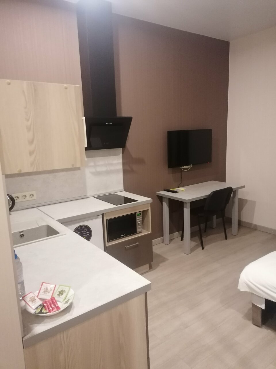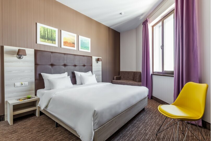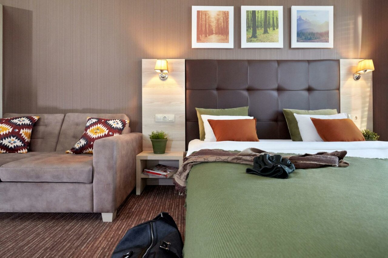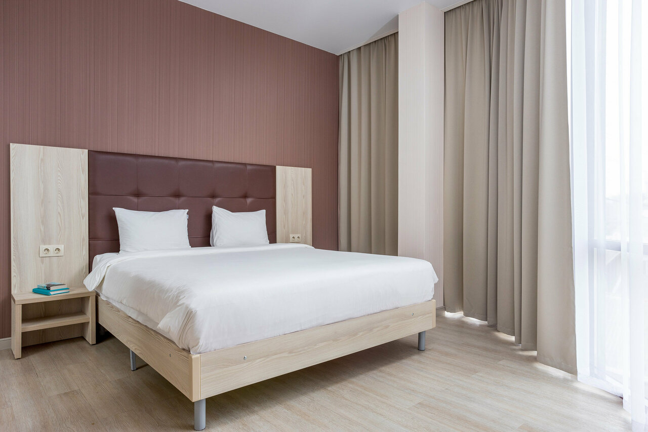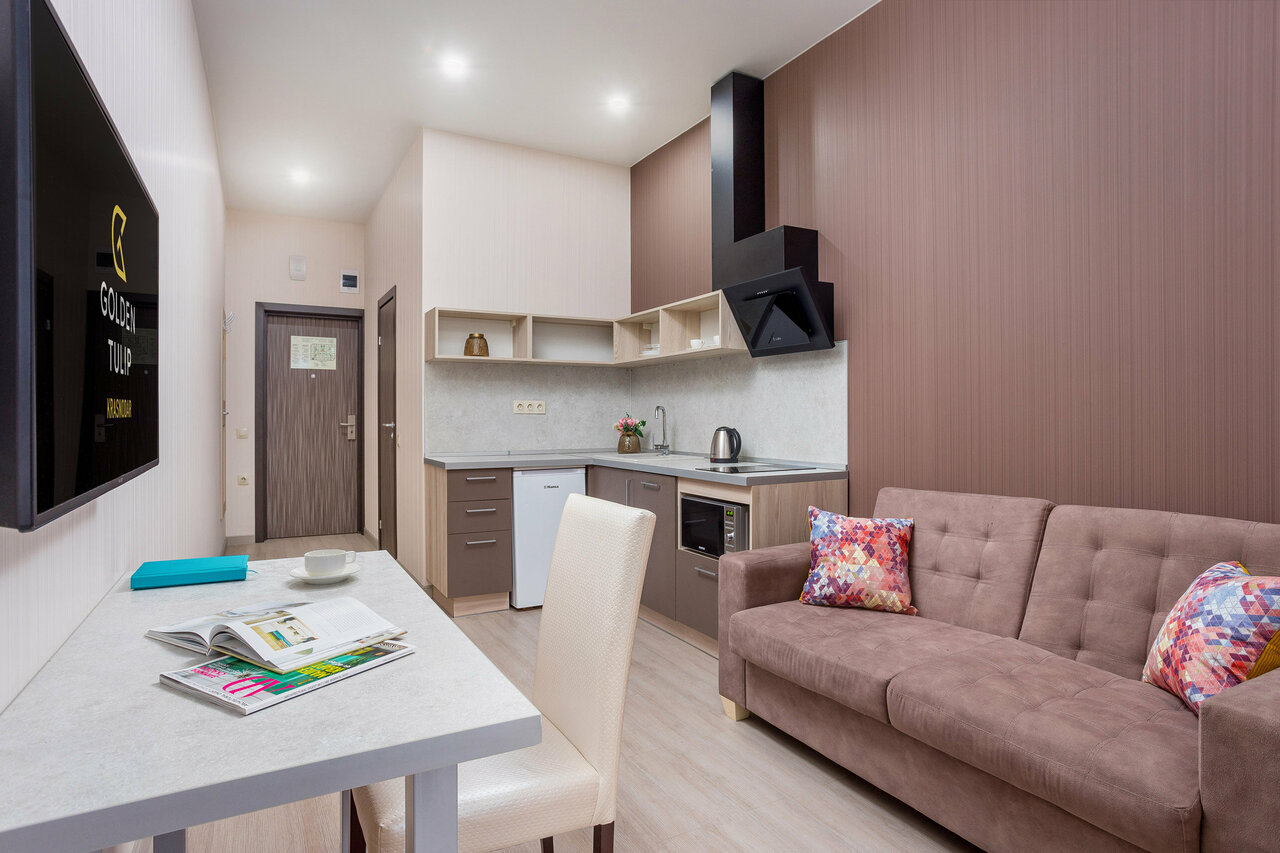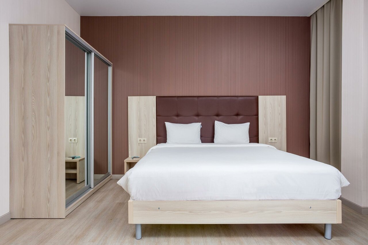 Брали апартаменты, все очень хорошо. Из минусов (маленьких) : В номере на двоих всего один стул к обеденному столу. Набор тарелок скудноват, на двоих маловато. У нас нож был маленький и не очень острый (в целом порезать было можно) Из плюсов: Закрытая парковка! Уборка каждый день. Ставят воду в бутылках(у нас ставили 2 наверно по количеству людей). Чай, кофе, сахар. Так же зубную щетку(вместе с маленьким тюбиком пасты). Также гель для душа. Кровать большая, очень удобная средней жёсткости. По две розетки с каждой стороны и тумбочки. В обеденной зоне диван — так же очень удобный. На кухне есть посудомойка, хотя по сути она не нужна =) На мой взгляд места больше чем кажется на фото. Так же ресторан просто обалденный. Очень вкусно и по цене приятно. Авторские блюда конечно уже будут дороже)