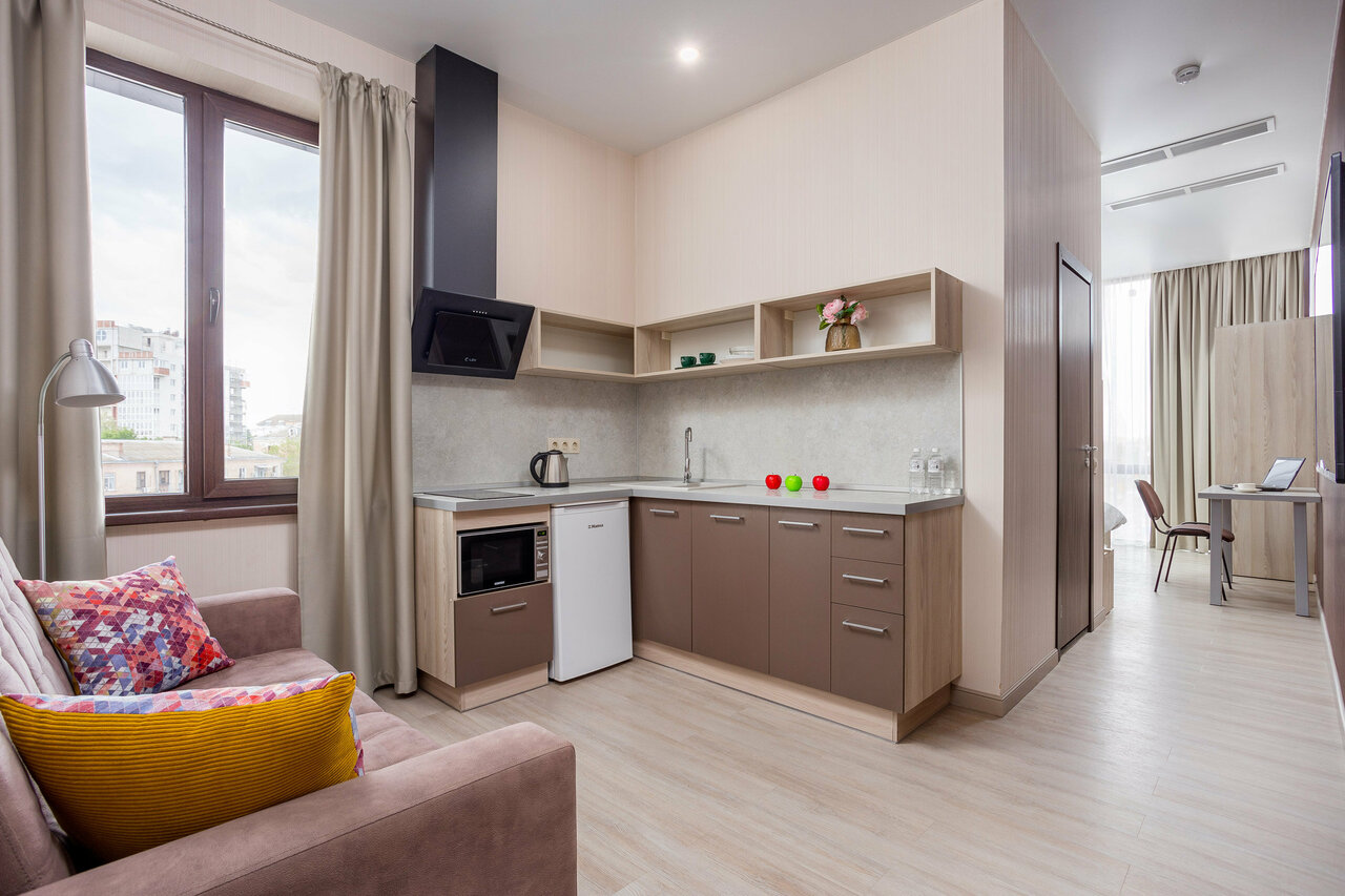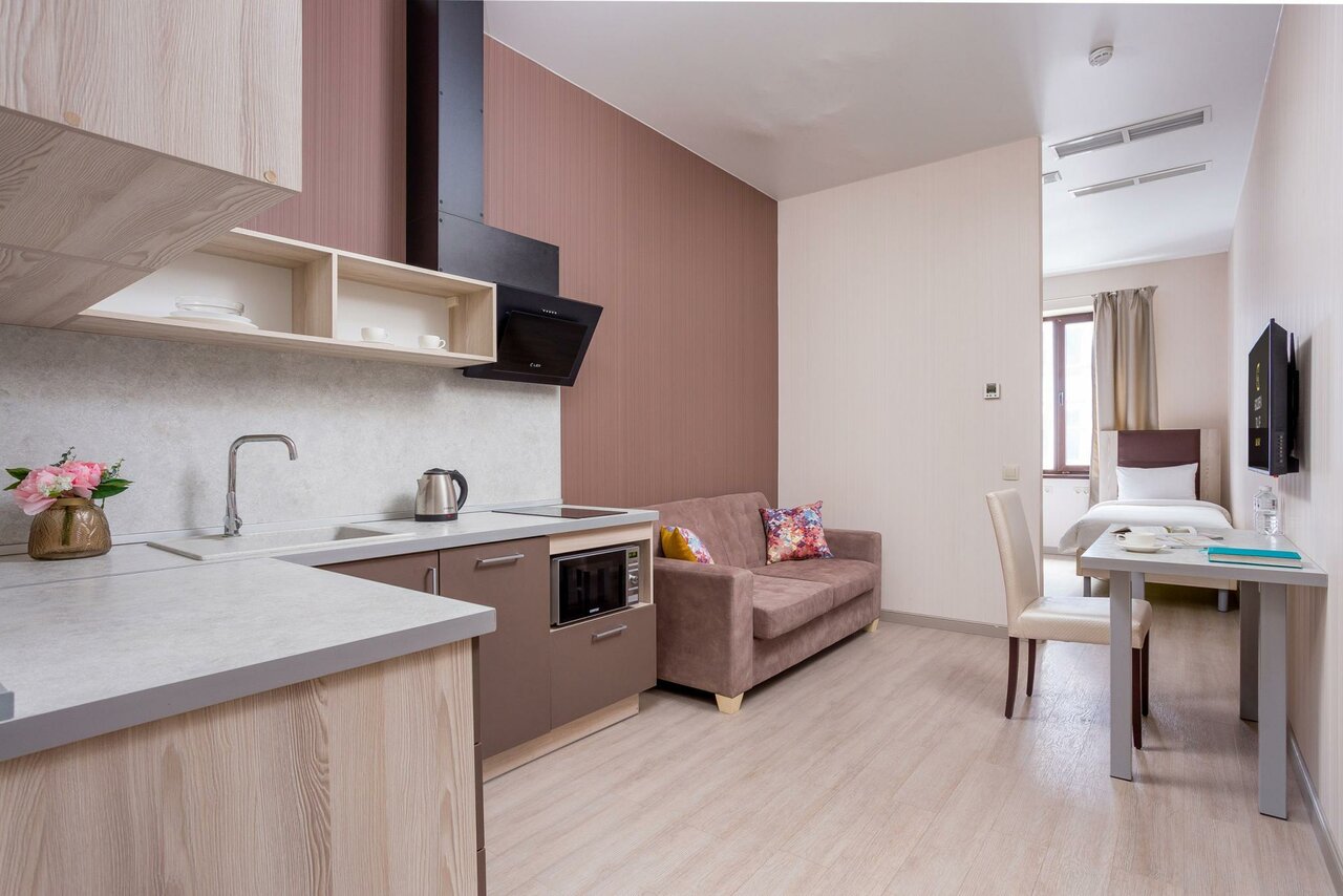 - Наличие посудомоечной машины (в апартаментах).