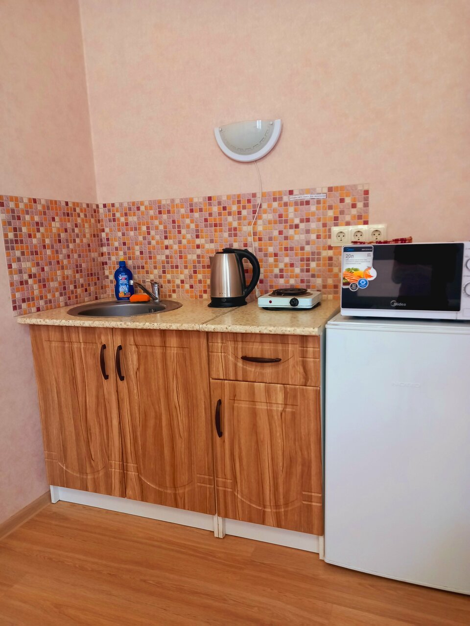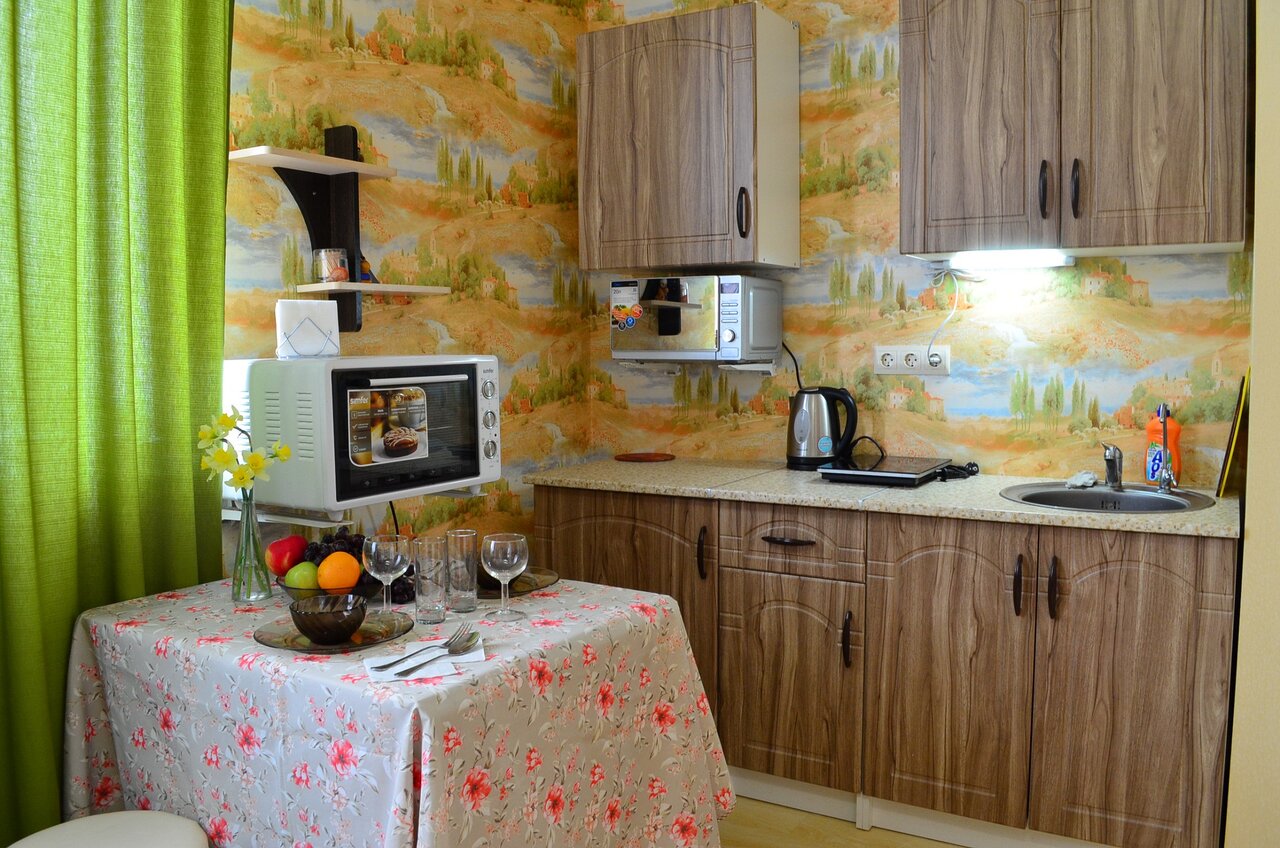 - Хорошо оборудованная кухонная зона (плита, микроволновка, холодильник, чайник, посуда).