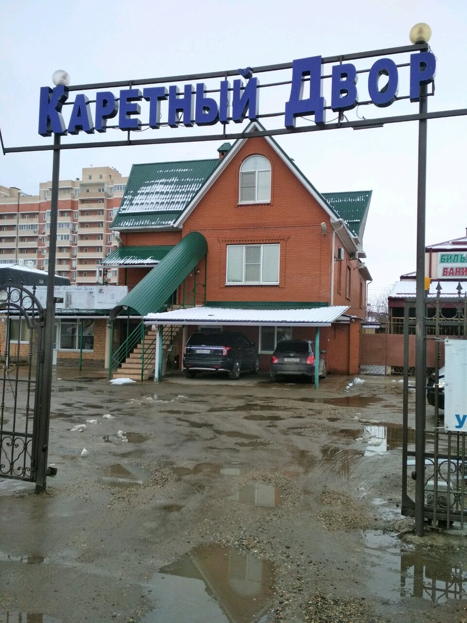 Гостиница «Каретный двор» расположена в Краснодаре по адресу: Российская улица, 325. Заведение работает круглосуточно и предлагает комфортное размещение в номерах с кондиционером, Wi-Fi, телевизором, холодильником и чайником. Гости могут воспользоваться крытым бассейном, сауной, хаммамом, баней, бильярдом, караоке и баром. На территории доступны бесплатная парковка, общая кухня, стиральная машина и уборка. Предоставляются завтраки по меню, халаты и тапочки. Время заезда — с 14:00, выезда — до 12:00.