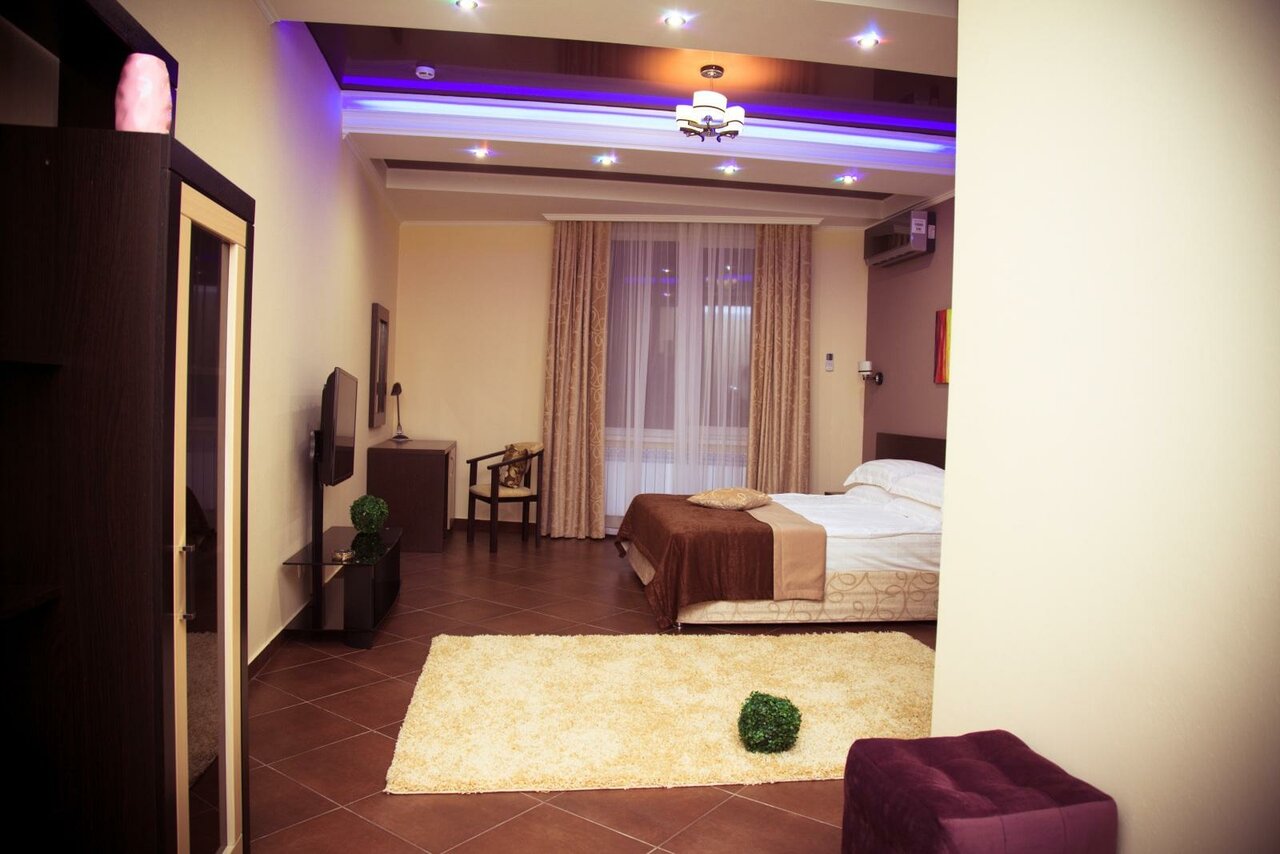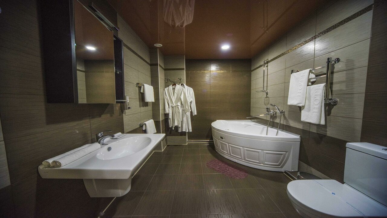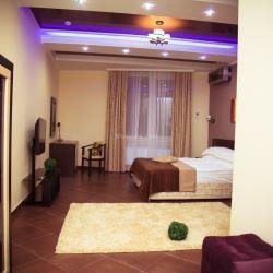 Просторный двухкомнатный номер с двуспальной кроватью. В номере так же есть джакузи, выход в сауну и к бассейну.