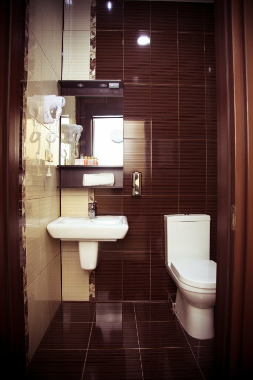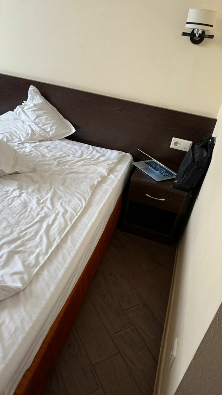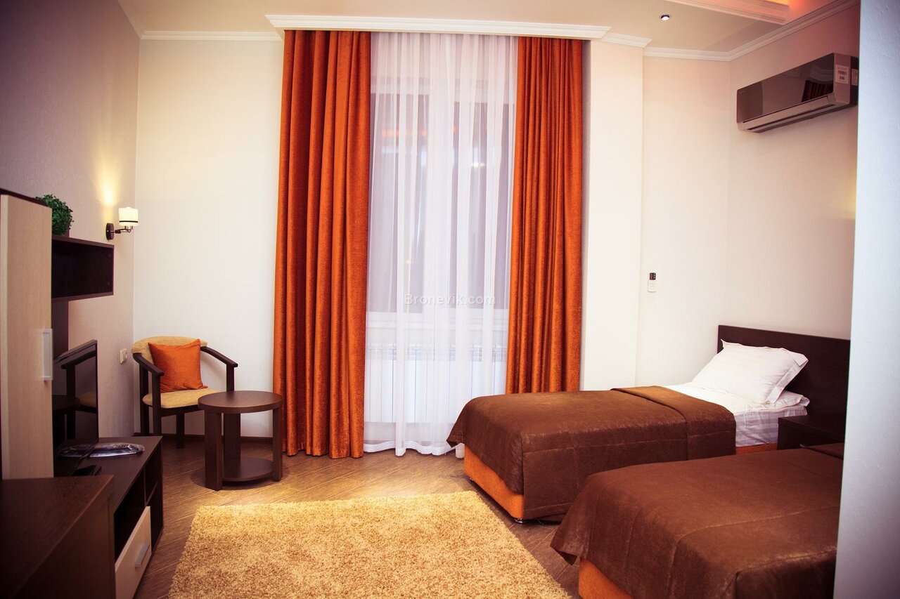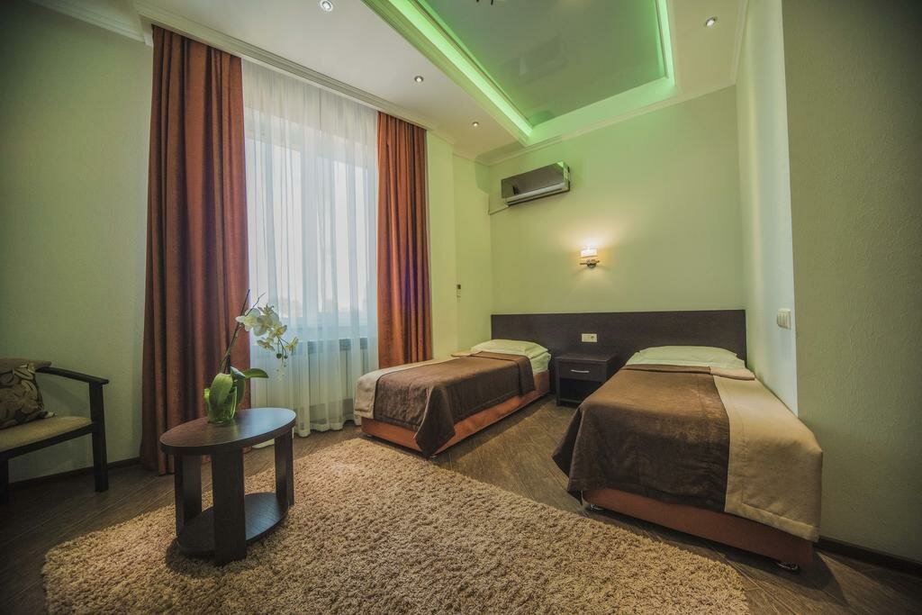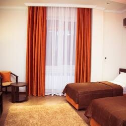 Останавливался на пару дней, обычный отель 2 звёзды. Номер просторны с видом на частный сектор. Две кровати совмещены, но между ними щель из-за двух матрасов, к сведению для будущих жильцов. Выбрал из-за близкого расположения к работе и больше плюсов нет. Из минусов: не убирались в номере, не меняли мыльные принадлежности соответственно. Номер обычный, отбитые углы плинтусов, пыльно. Завтрак включён был, по факту чай, яичница и пару сосисок. Когда жарят яйца, запах стоит на весь отель, если в коридоре стоять, то все вещи пахнут едой. Сложилось впечатление, что в отеле проживал один, никого не видел, а персонал вечером отдыхал в ресторане, выпивали, пели, музыка играла громко, что слышно в номере. Да, ресторан не работает — не сможете поужинать. В целом переночевать по работе норм, цена если не дороже 1,500р/сутки приемлемо.