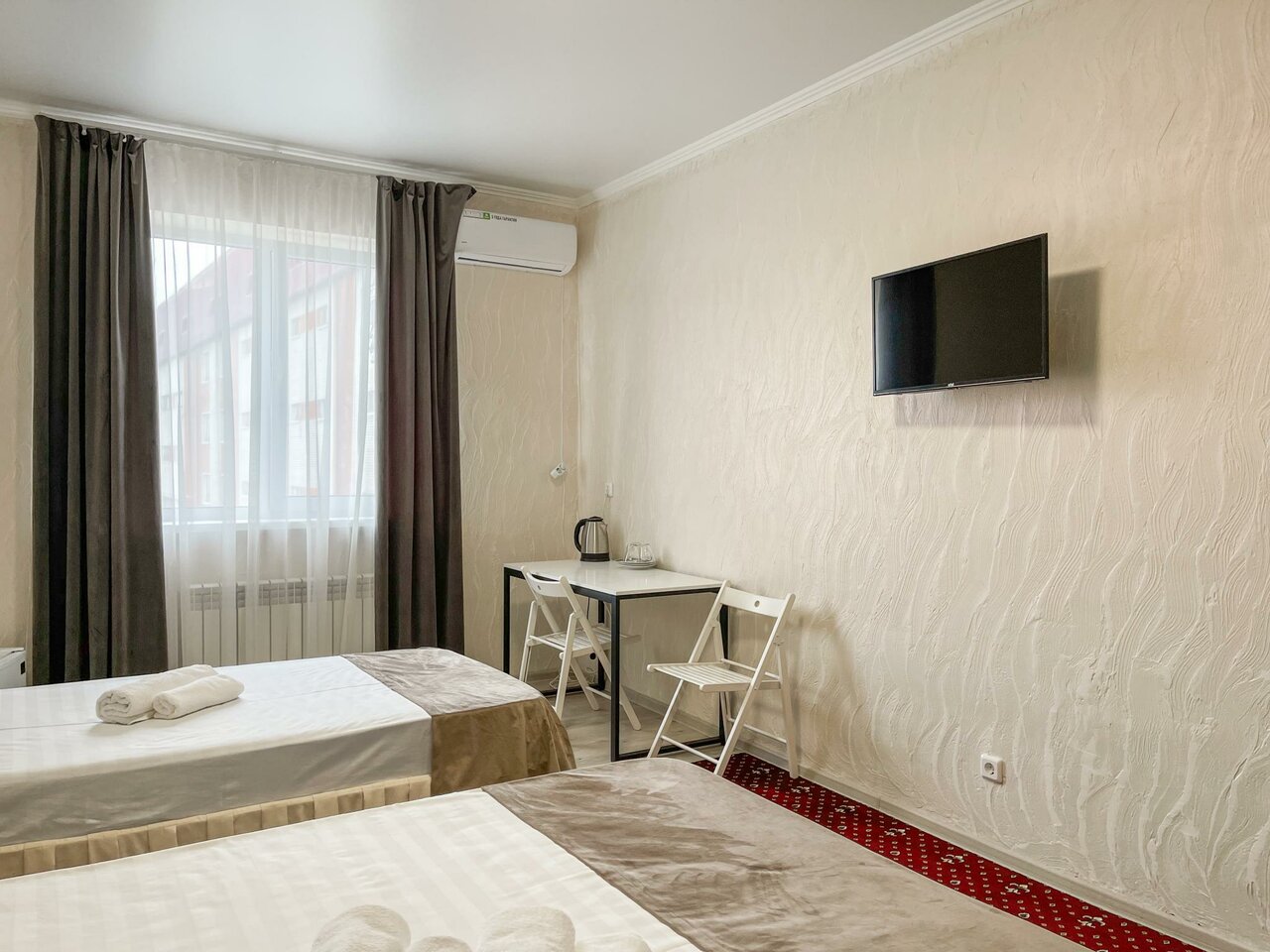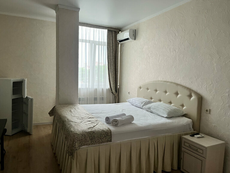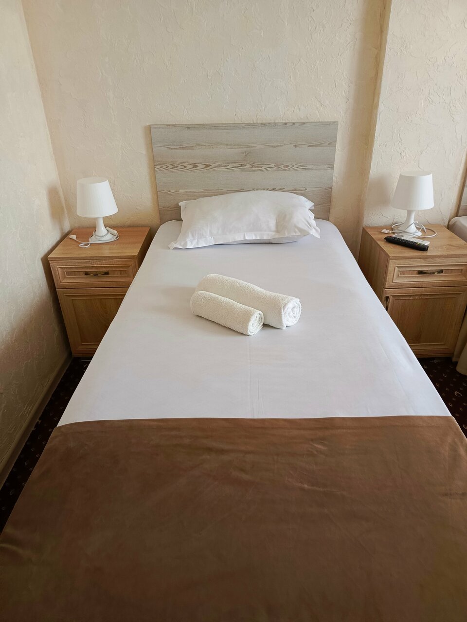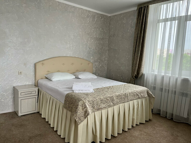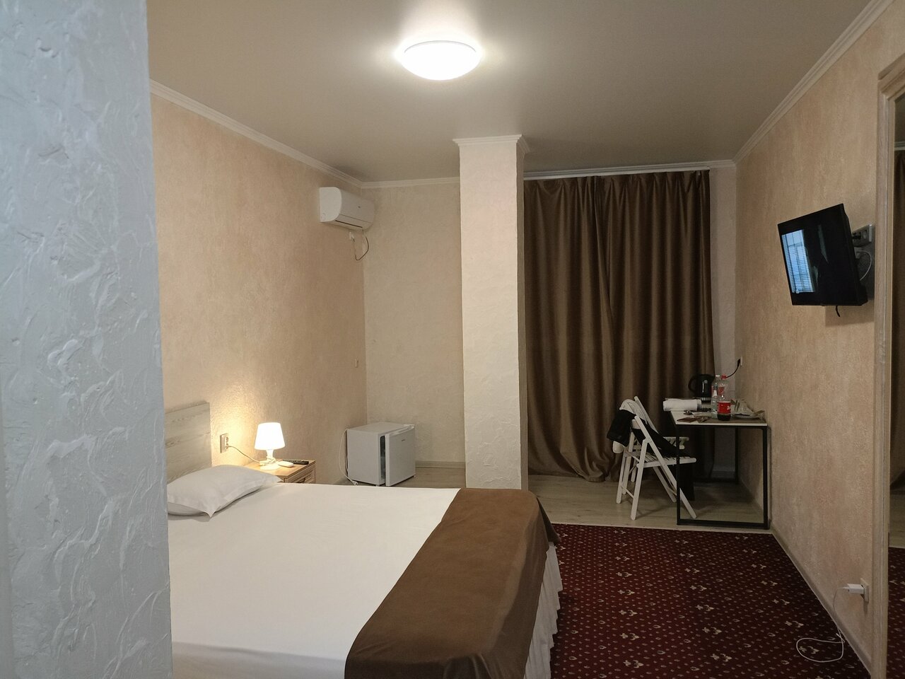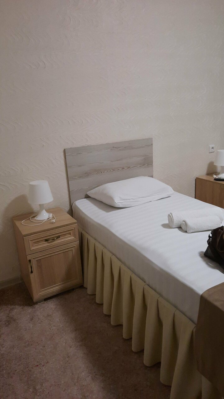 Заказали номер на сайте Яндекс путешествия, что очень удобно и помогло сэкономить. Сняли номер на двоих с ребёнком. Ехали проездом на море. Номер чистый, просторный. Огромная двуспальная кровать и односпалка для ребёнка. Белоснежное бельё, косметические принадлежности, полотенца, фен. Столик, стулья, чайник, чай, кофе. Холодильник и телевизор работает. В отеле есть кафе, что удобно, работает до 9:00. Попали на ужин- борщ на 5+. Спасибо повару! Есть всё необходимое на этаже гладилка с утюгом, кулер с водой. Кстати имеется парковка для авто. Персонал вежливый.