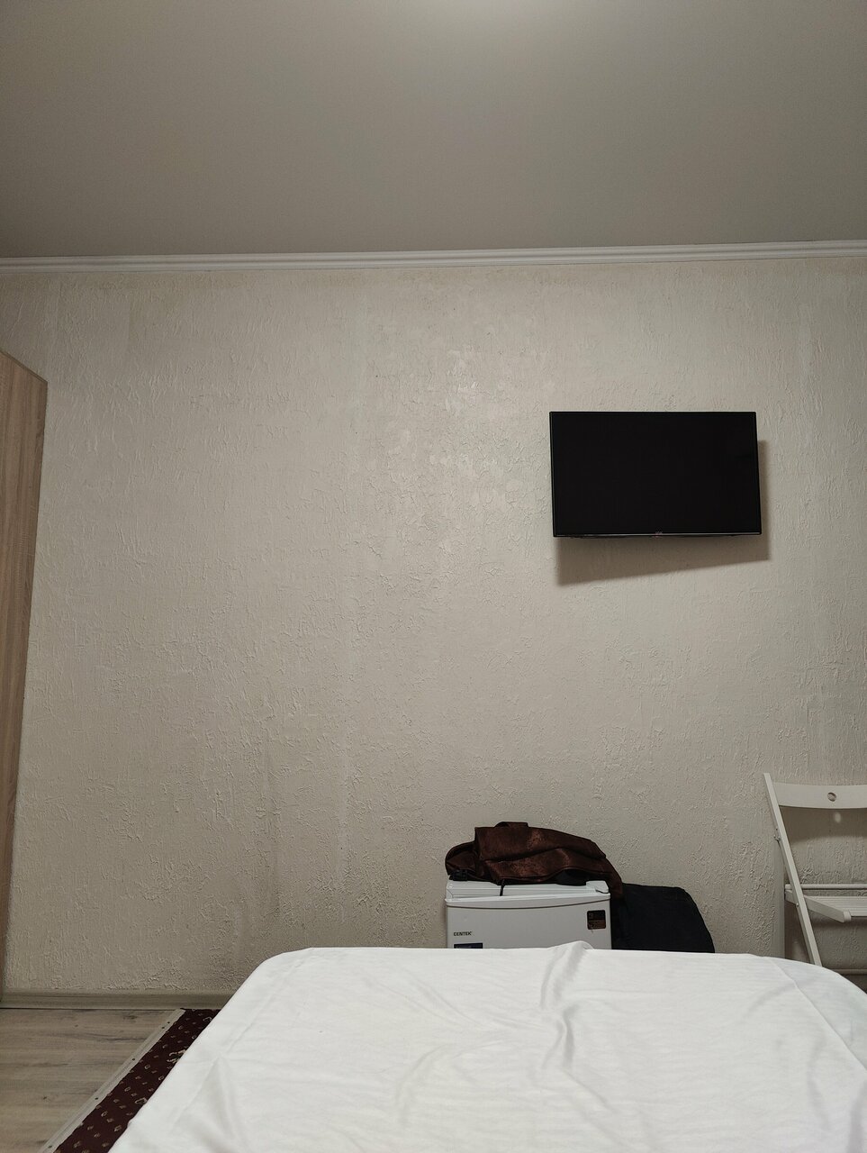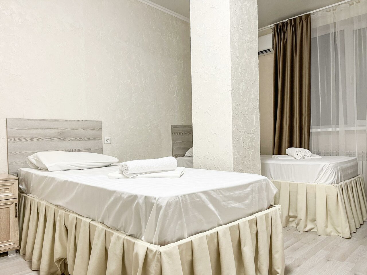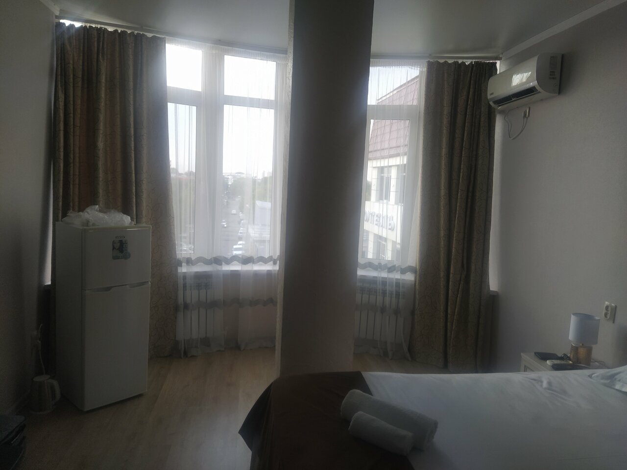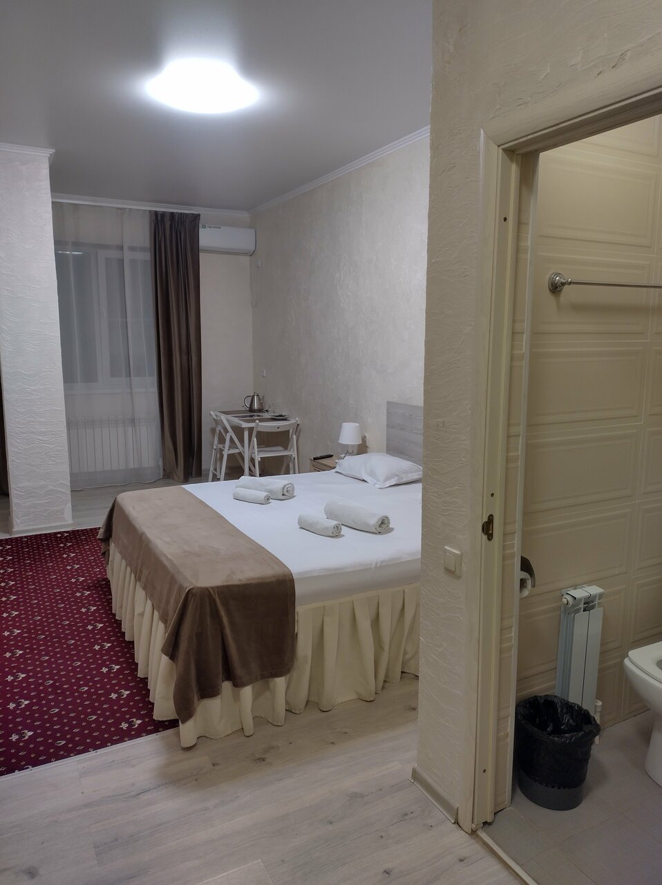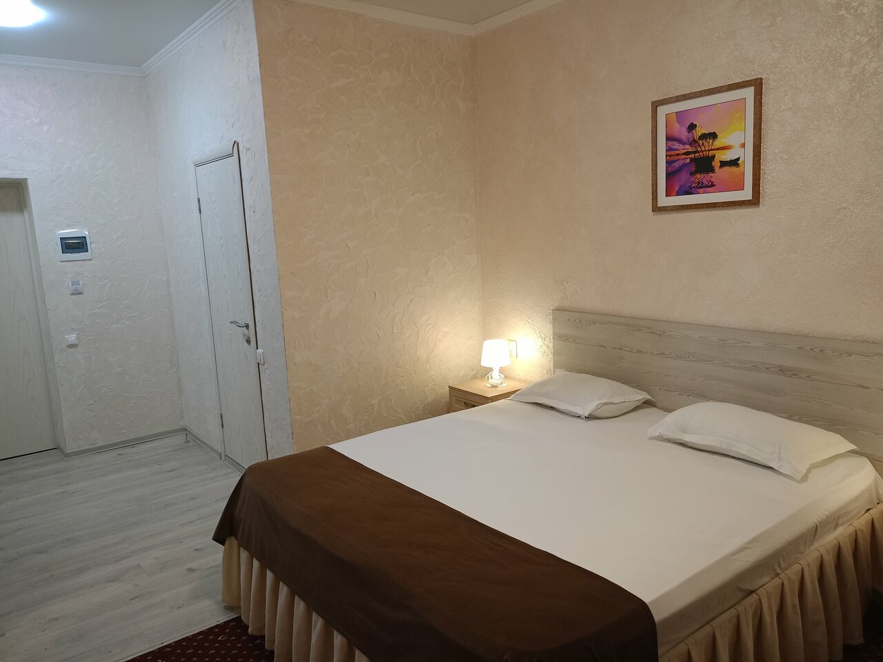 Заказали номер на сайте Яндекс путешествия, что очень удобно и помогло сэкономить. Сняли номер на двоих с ребёнком. Ехали проездом на море. Номер чистый, просторный. Огромная двуспальная кровать и односпалка для ребёнка. Белоснежное бельё, косметические принадлежности, полотенца, фен. Столик, стулья, чайник, чай, кофе. Холодильник и телевизор работает. В отеле есть кафе, что удобно, работает до 9:00. Попали на ужин- борщ на 5+. Спасибо повару! Есть всё необходимое на этаже гладилка с утюгом, кулер с водой. Кстати имеется парковка для авто. Персонал вежливый.