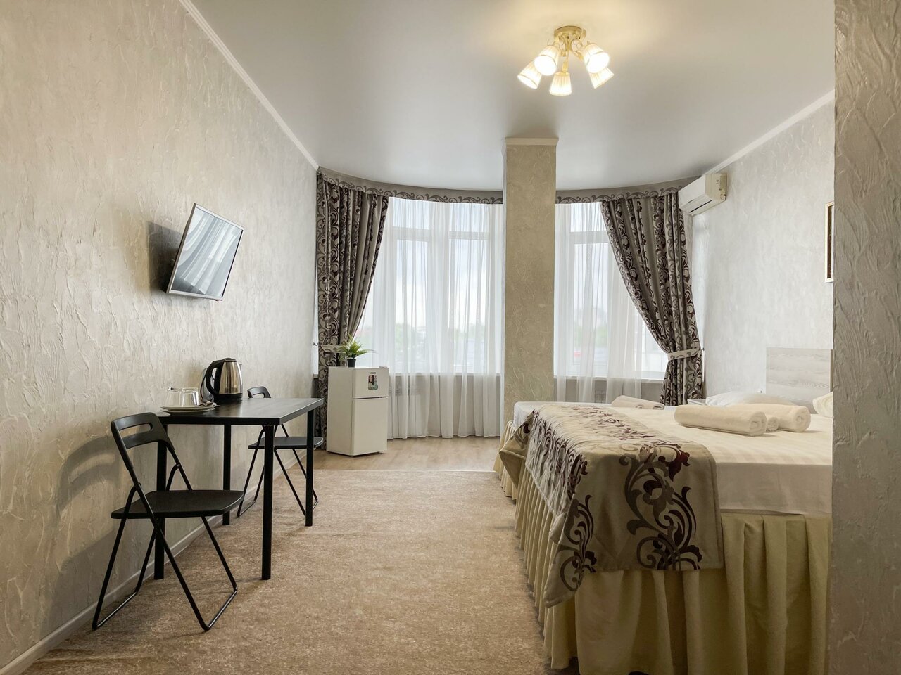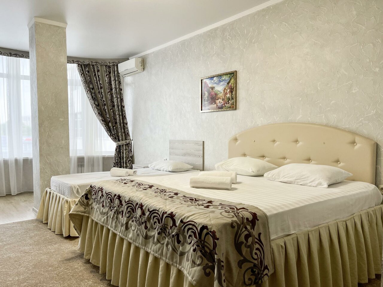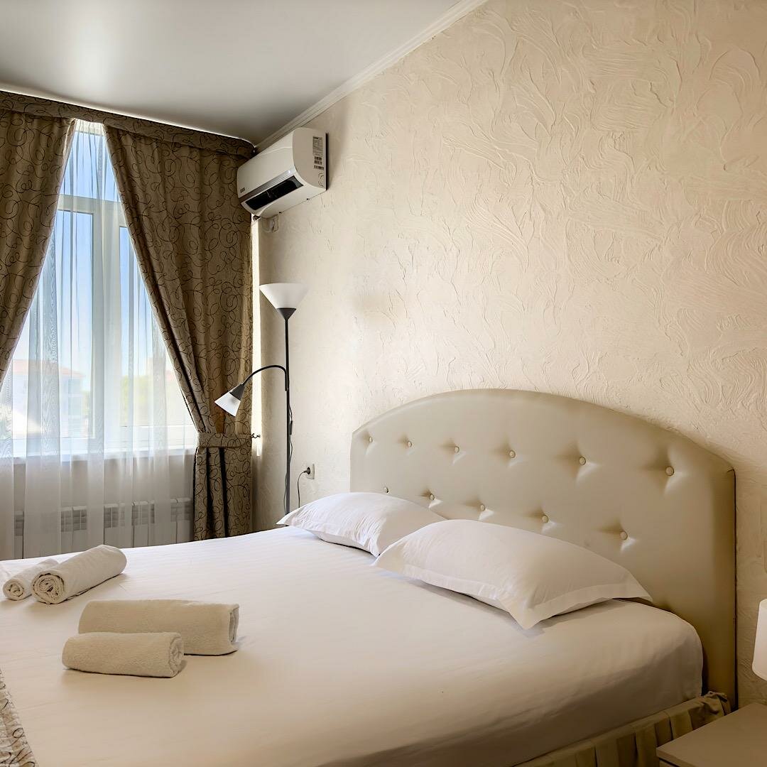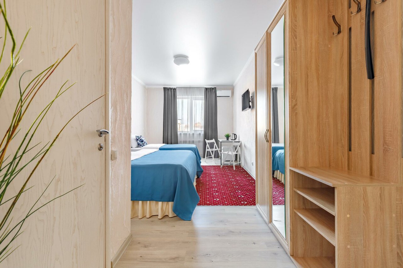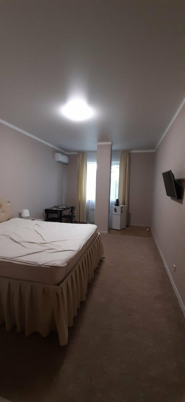 Заказали номер на сайте Яндекс путешествия, что очень удобно и помогло сэкономить. Сняли номер на двоих с ребёнком. Ехали проездом на море. Номер чистый, просторный. Огромная двуспальная кровать и односпалка для ребёнка. Белоснежное бельё, косметические принадлежности, полотенца, фен. Столик, стулья, чайник, чай, кофе. Холодильник и телевизор работает. В отеле есть кафе, что удобно, работает до 9:00. Попали на ужин- борщ на 5+. Спасибо повару! Есть всё необходимое на этаже гладилка с утюгом, кулер с водой. Кстати имеется парковка для авто. Персонал вежливый.