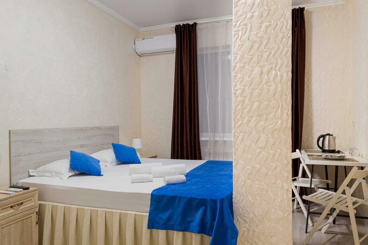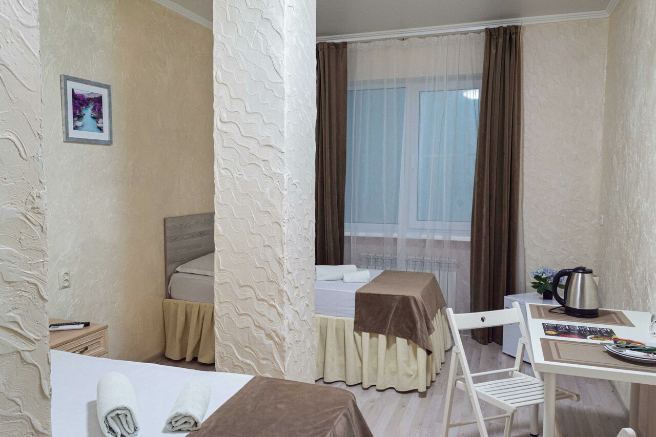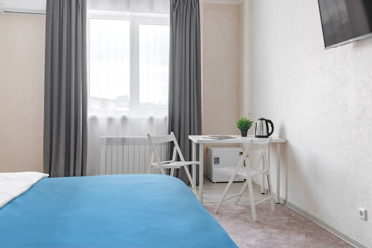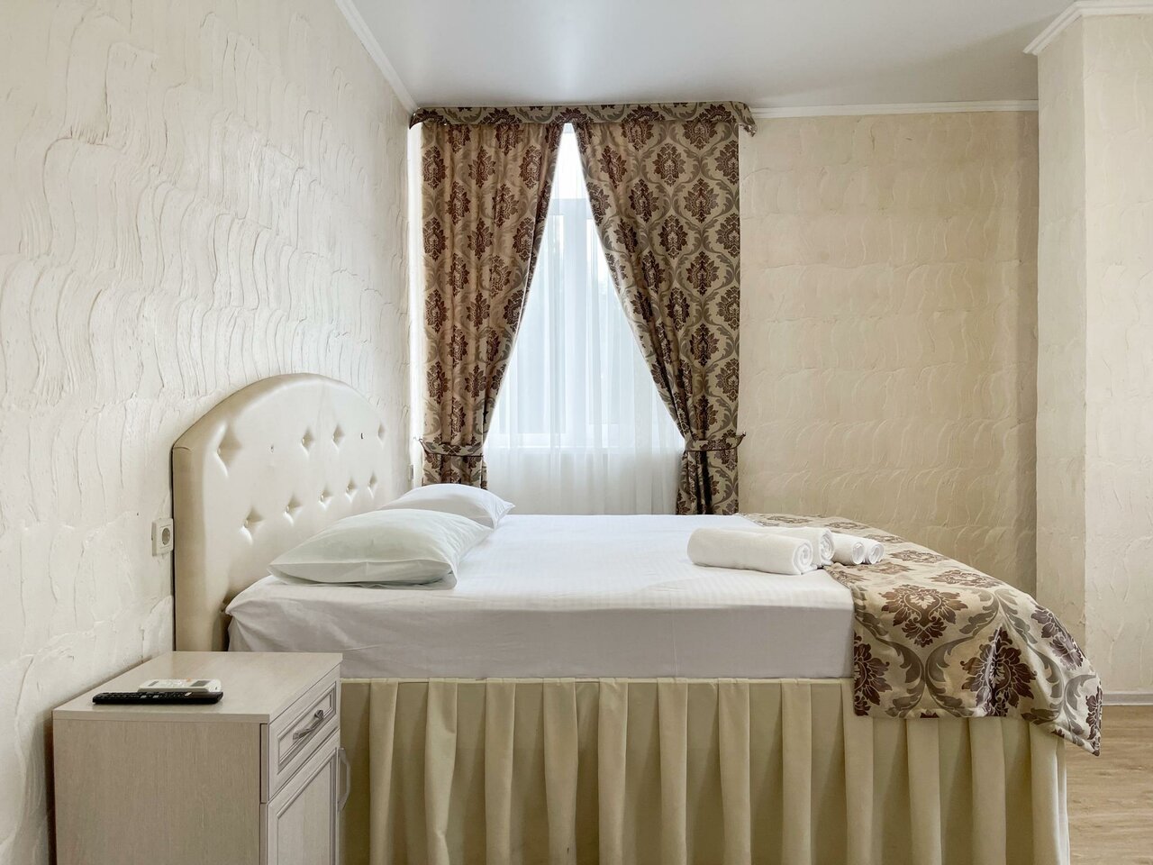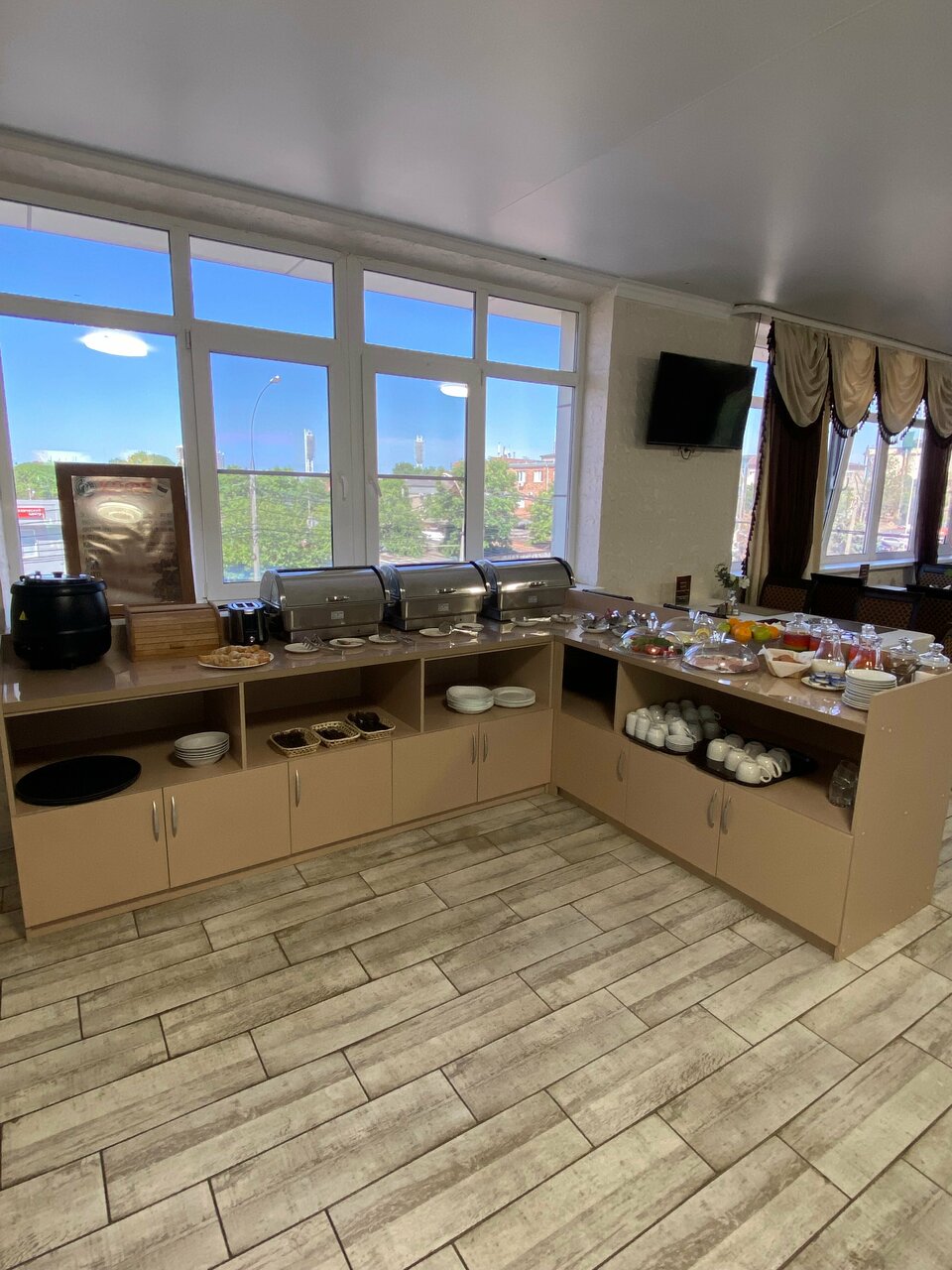 Заказали номер на сайте Яндекс путешествия, что очень удобно и помогло сэкономить. Сняли номер на двоих с ребёнком. Ехали проездом на море. Номер чистый, просторный. Огромная двуспальная кровать и односпалка для ребёнка. Белоснежное бельё, косметические принадлежности, полотенца, фен. Столик, стулья, чайник, чай, кофе. Холодильник и телевизор работает. В отеле есть кафе, что удобно, работает до 9:00. Попали на ужин- борщ на 5+. Спасибо повару! Есть всё необходимое на этаже гладилка с утюгом, кулер с водой. Кстати имеется парковка для авто. Персонал вежливый.