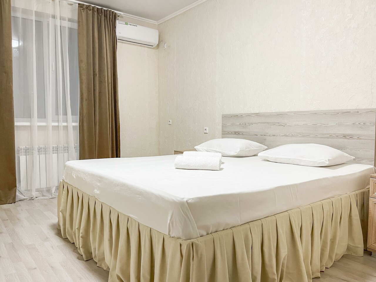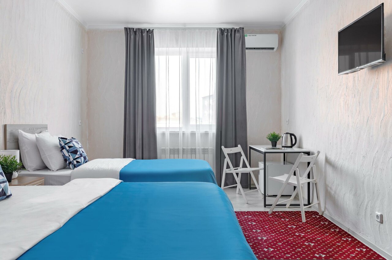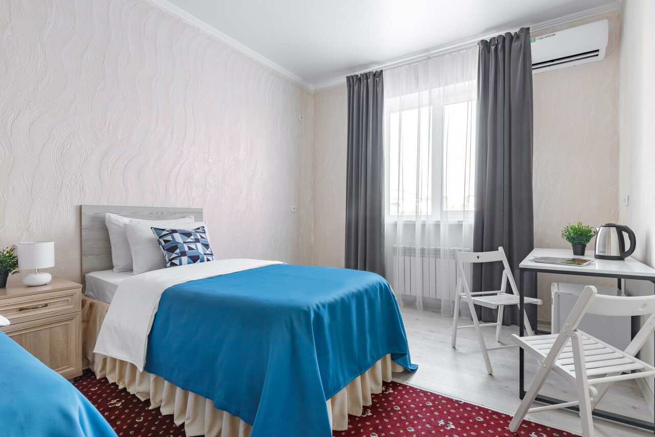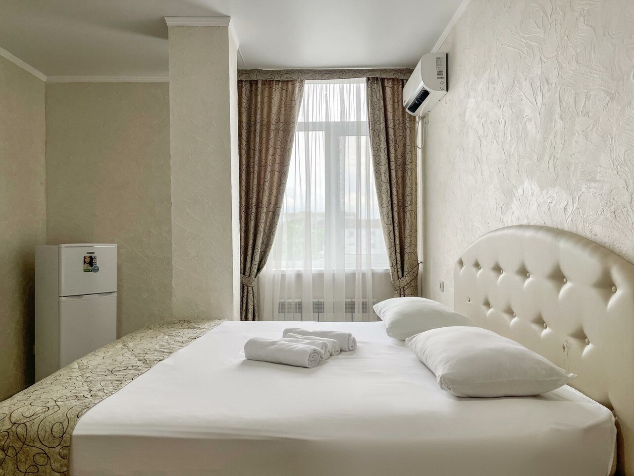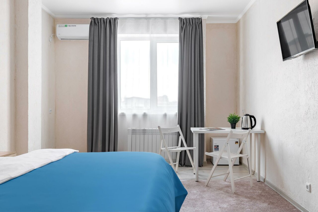 Заказали номер на сайте Яндекс путешествия, что очень удобно и помогло сэкономить. Сняли номер на двоих с ребёнком. Ехали проездом на море. Номер чистый, просторный. Огромная двуспальная кровать и односпалка для ребёнка. Белоснежное бельё, косметические принадлежности, полотенца, фен. Столик, стулья, чайник, чай, кофе. Холодильник и телевизор работает. В отеле есть кафе, что удобно, работает до 9:00. Попали на ужин- борщ на 5+. Спасибо повару! Есть всё необходимое на этаже гладилка с утюгом, кулер с водой. Кстати имеется парковка для авто. Персонал вежливый.