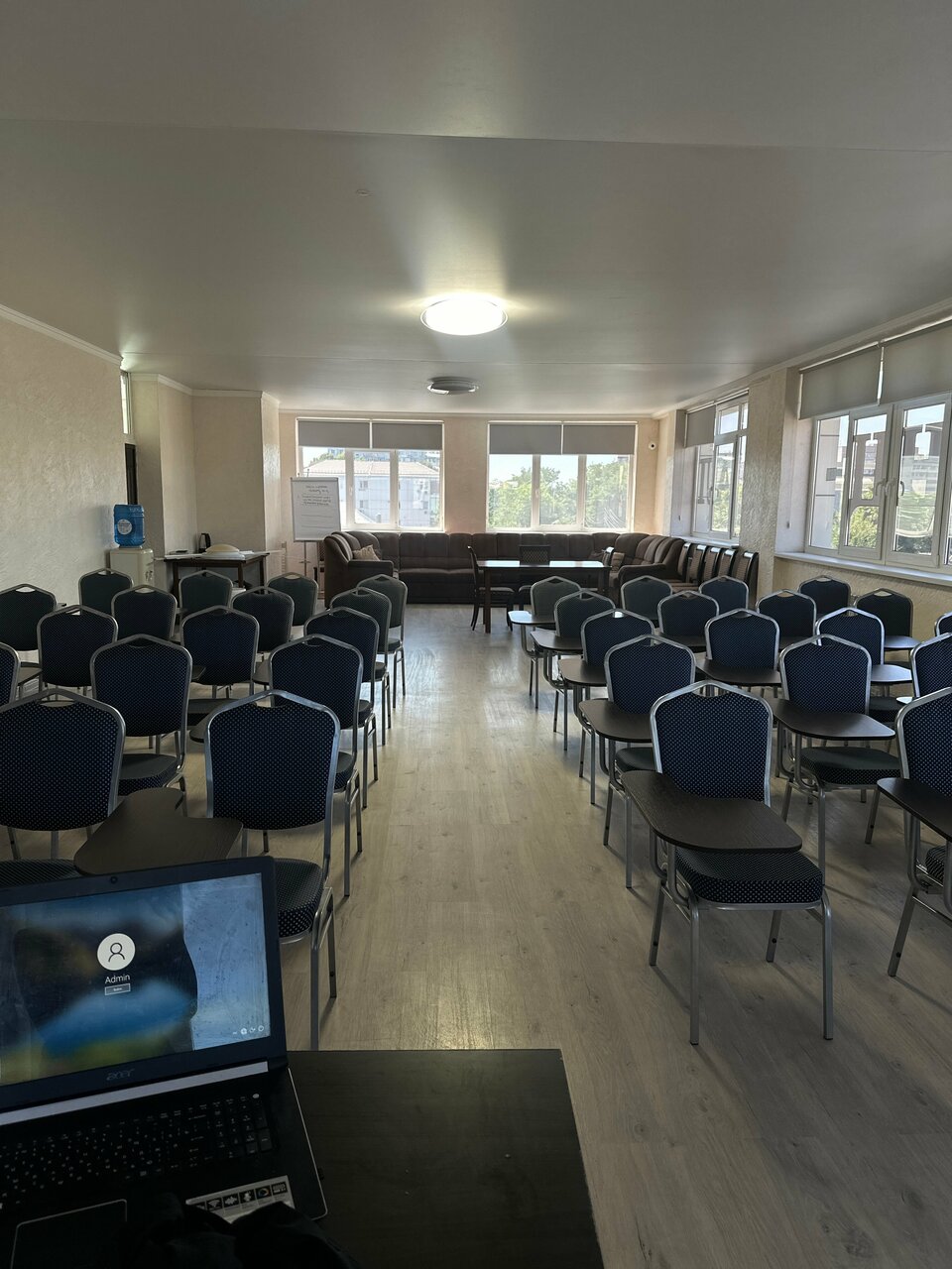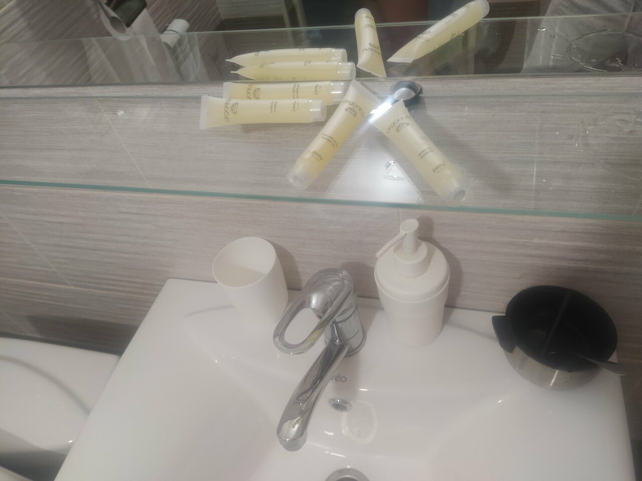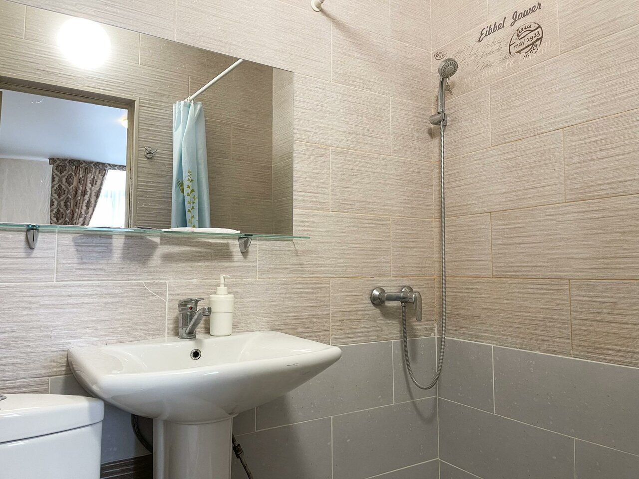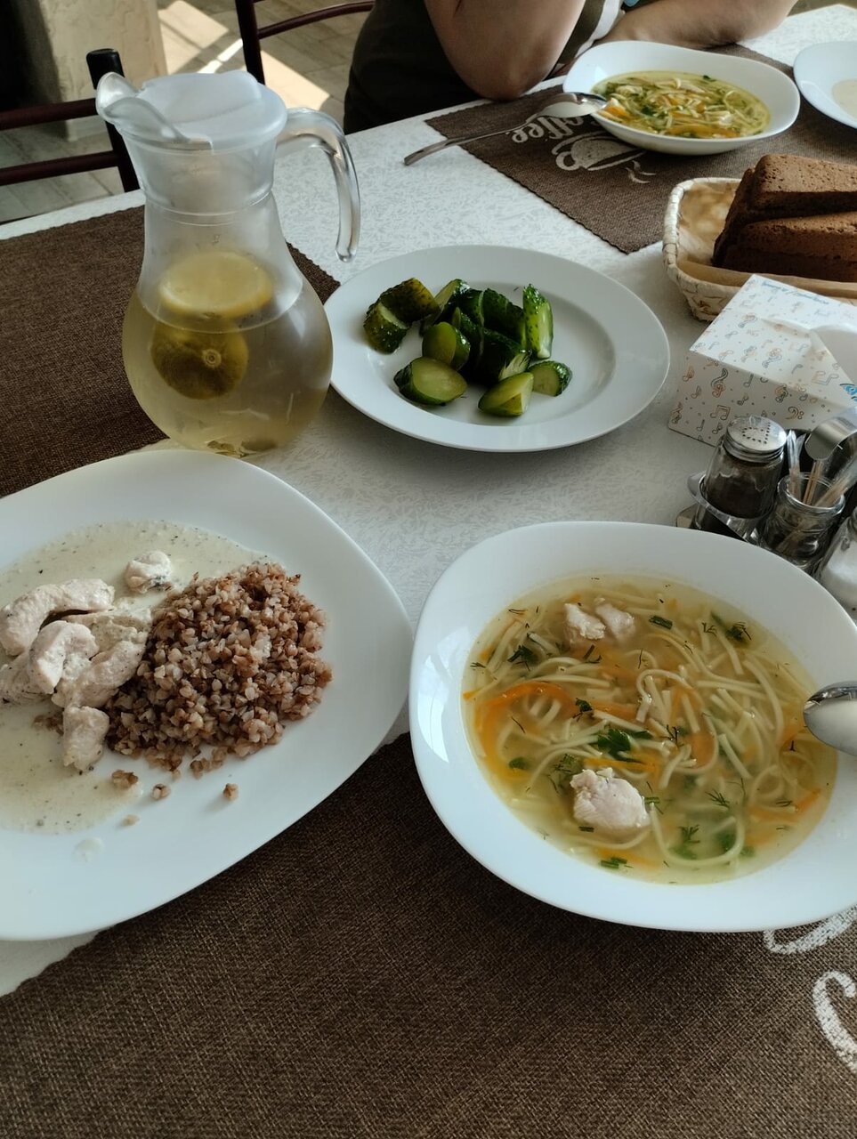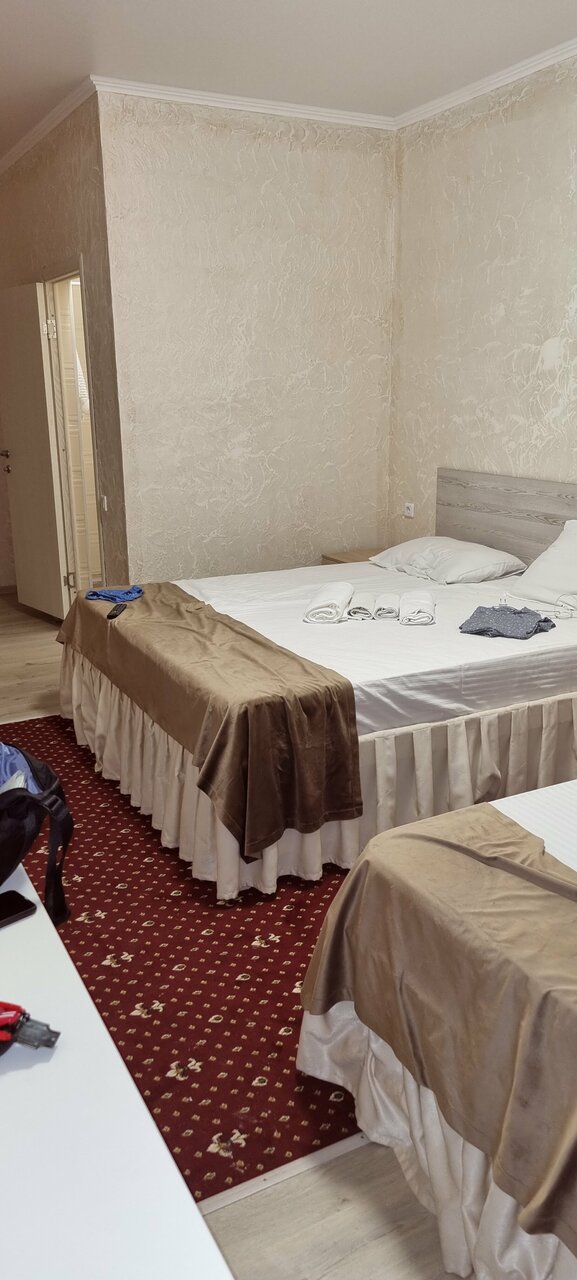 Бронировали заранее номер 3х местный, опираясь на расположение, цены и отзывы. С номером повезло, чисто. Все необходимое есть: холодильник, шкаф, сплитсистема, телевизор, стол пару стульев, кружки( так же положили 3 чайных пакетика на стол и 3 кофейных пакетика), в ванне полотенца, туалетная бумага, мини гели и шампунь, зубные щеточки с пастой. Обещали правда дать тапочки, но наверно забыли. Ресепшн вежливый. Кафе в отеле замечательное, готовят вкусно.