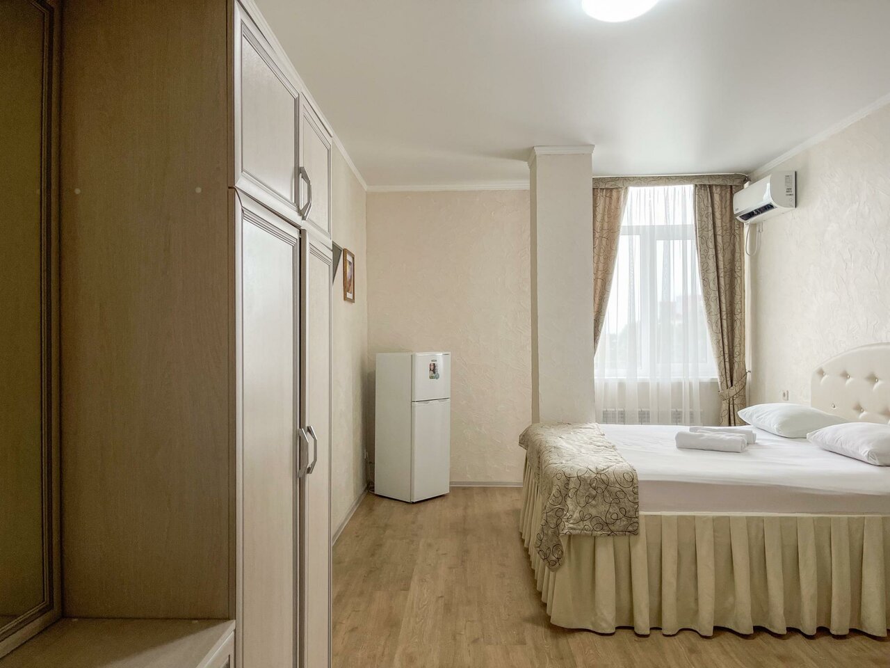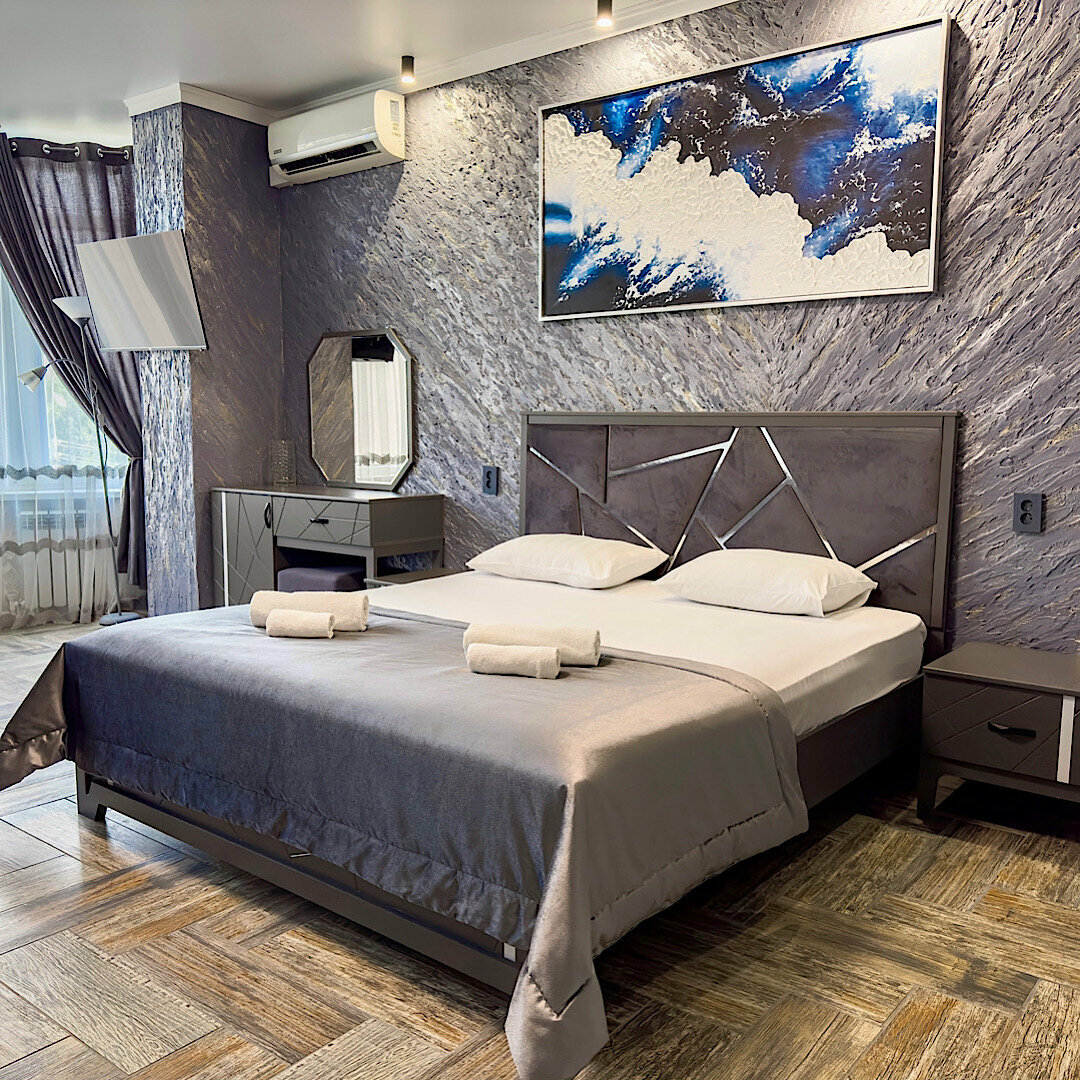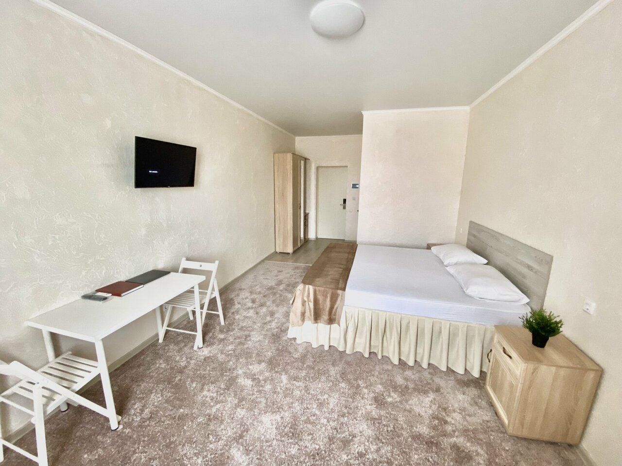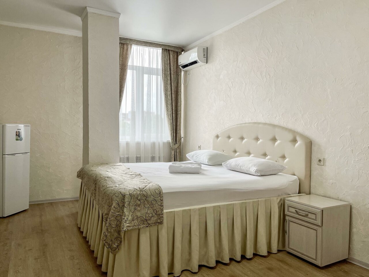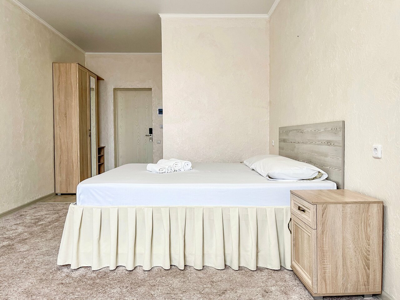 Джуниор Сюит . Улучшенный стандартный номер с двуспальной кроватью и бесплатным дополнительным местом на 3 человека.В номере есть все необходимое для проживания:Набор полотенец и косметикиТапочки (по запросу гостя)ФенХолодильникТелевизорШкаф