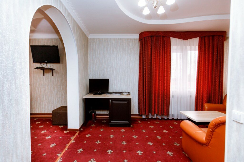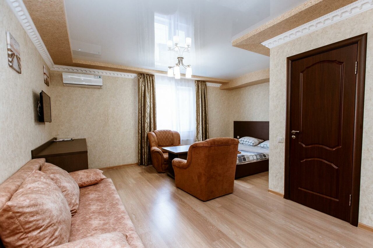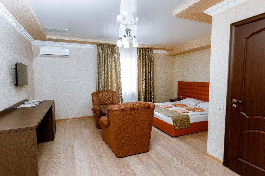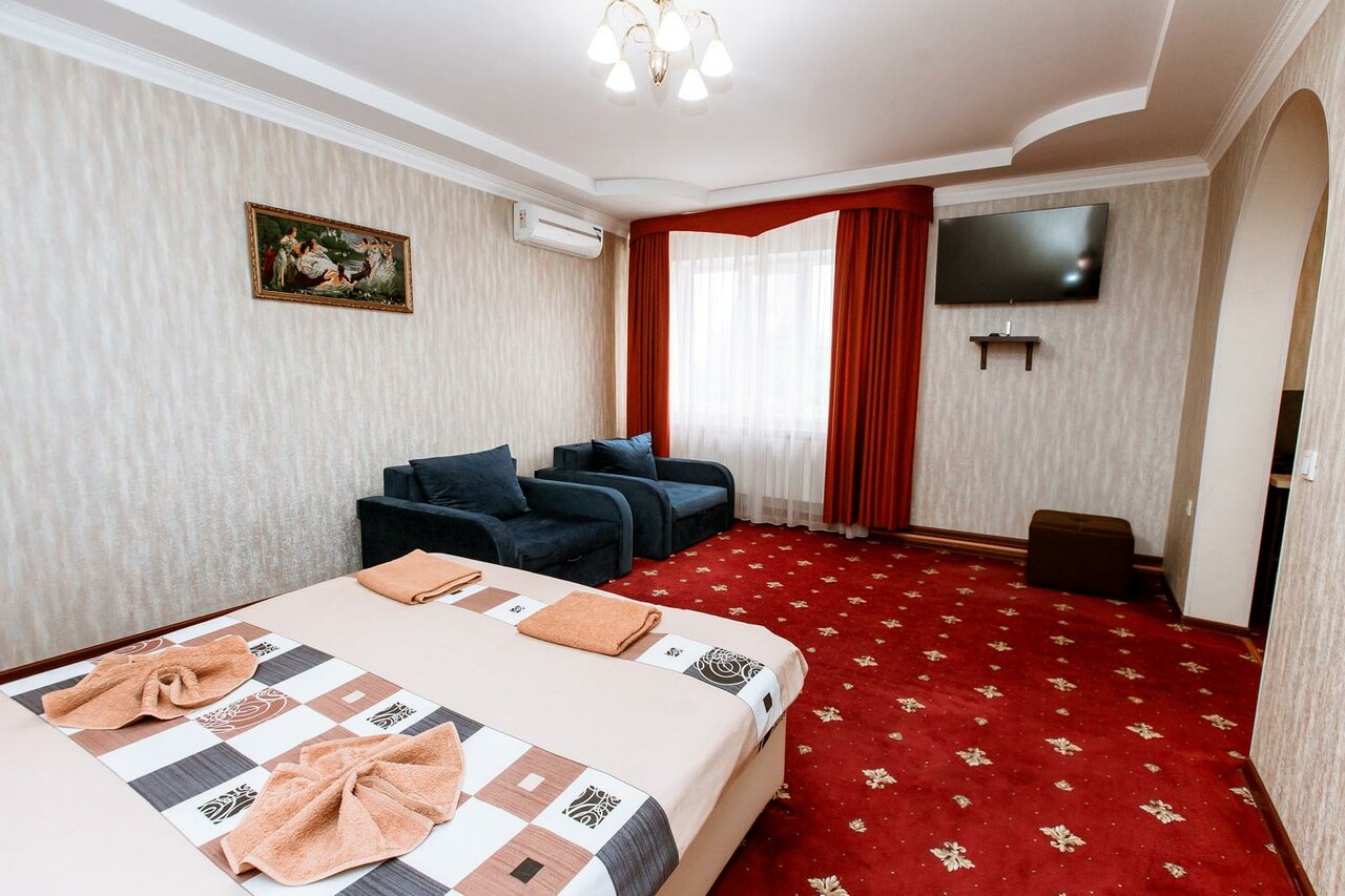 Близко от обьездной, есть хотя и небольшая но парковка. Люкс просторный, но уточняйте по типу спальных мест. Чисто. Круглосуточный рецепшн.
