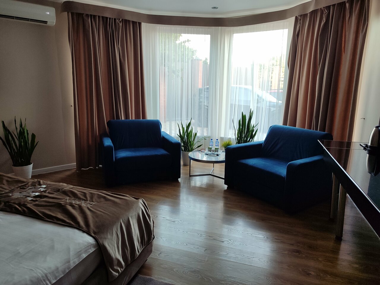 Номер люкс красивый и большой, хорошо убран. В гостинице нет охраны, ночью столкнулись с неадекватным пьяным мужчиной, которого естественно не могла утихомирить девушка-администратор.