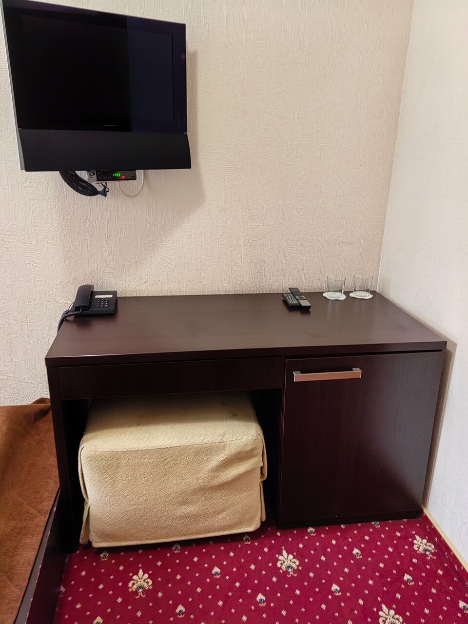 Не удивлен был долгому заселению — женщина работает всего третий день, интернета нет, обработать информацию на ПК просто нет возможности. Но в Яндекс путешествиях я же оплатил номер После долгих телефонных переговоров с коллегами она смогла!!! Итак, номер. Фото номеров в рекламе отеля не соответствуют действительности: поломанные выключатели, пыль особенно заметна на темной мебели. На фото пустой стол — ну нет там простого чайника и все тут! Хотите воды? Идите на первый этаж, там кулер, но без стаканчиков Какие халаты, если даже тапки нужно купить по сотне за пару, снова спустившись на первый этаж все это заведение скорее ночлежка, чем отель.