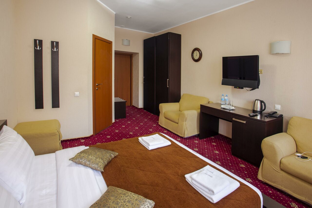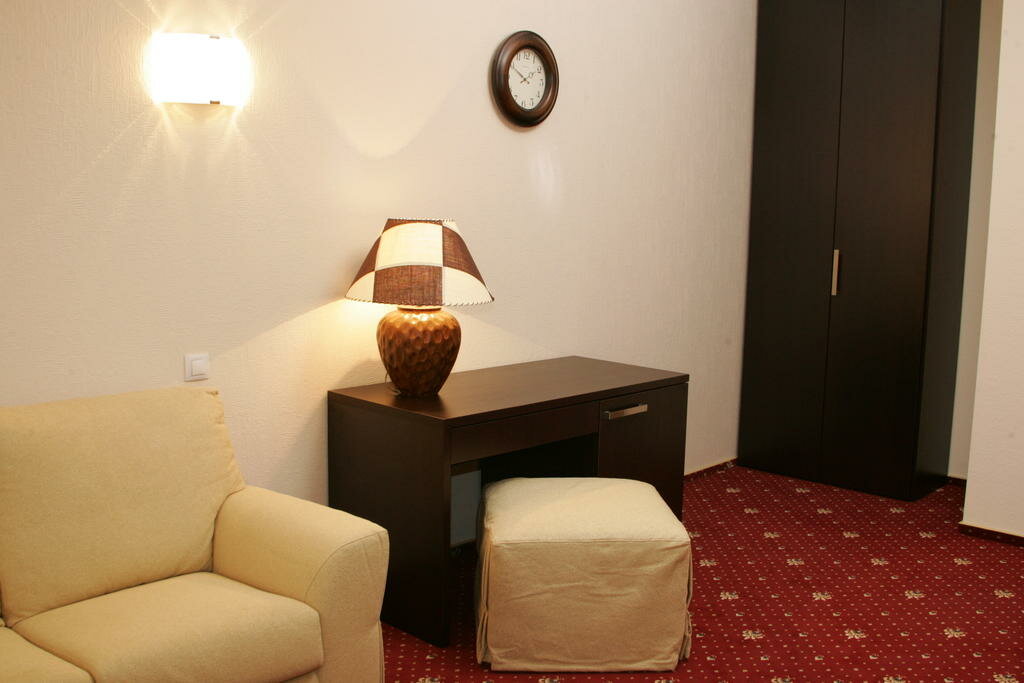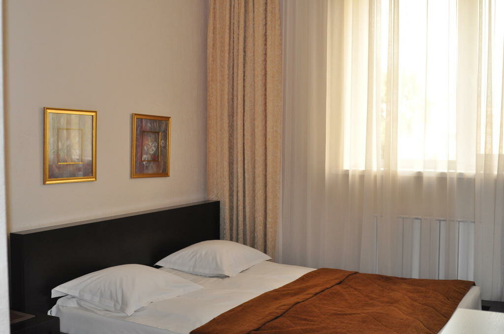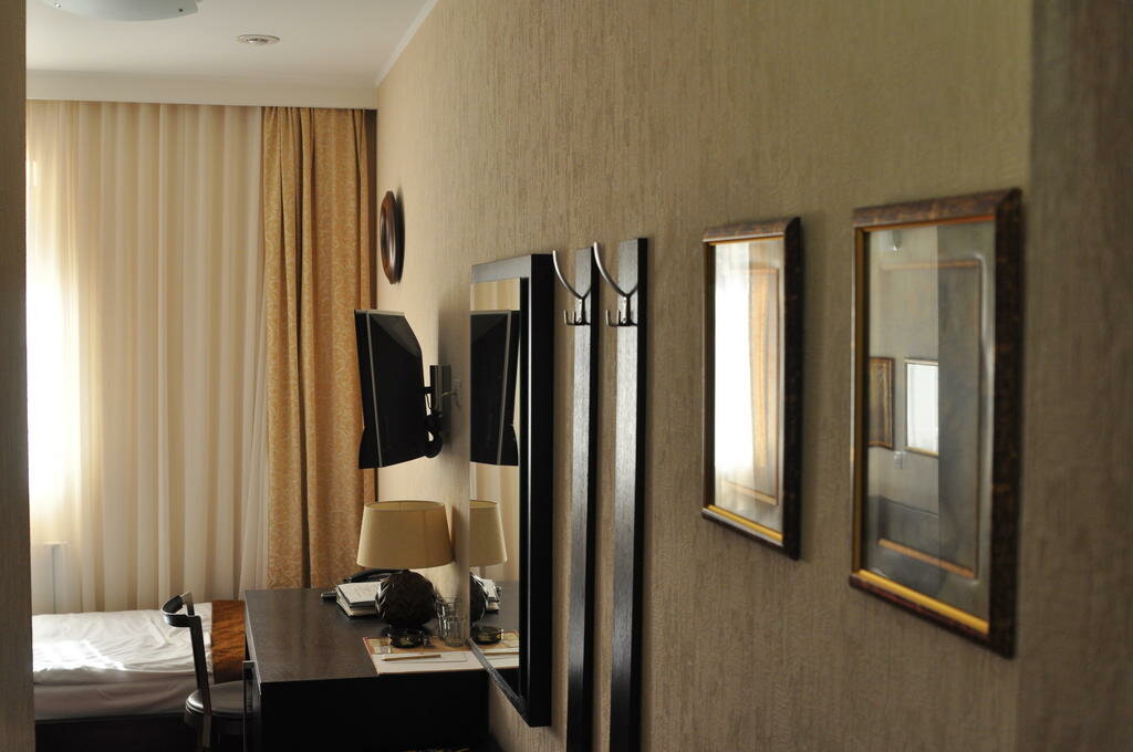 - Спокойная и тихая обстановка в отеле.; Удобное расположение (недалеко от вокзала).; Круглосуточный ресепшн.; Просторный номер с местом для вещей.; Наличие фена в номере.