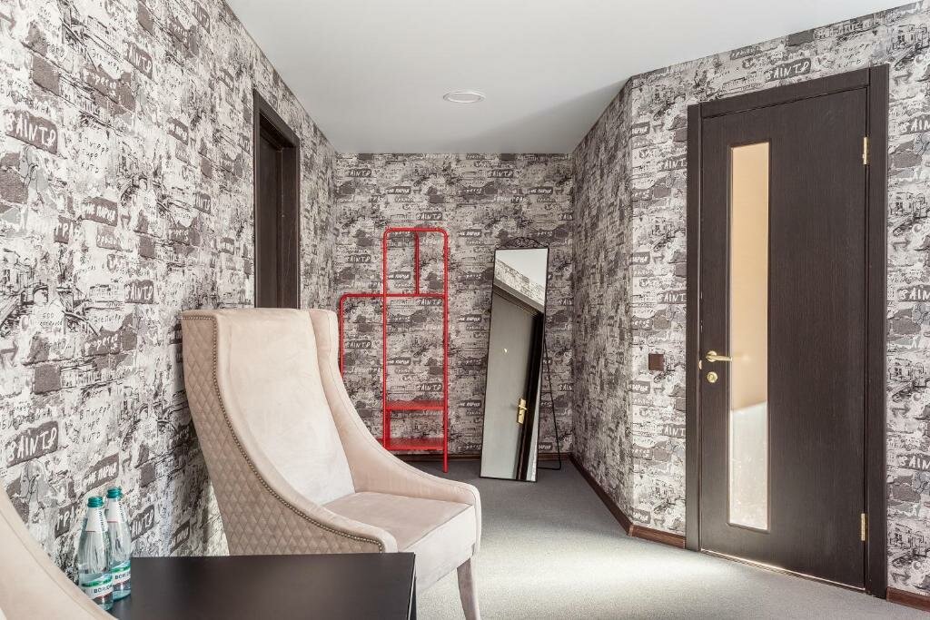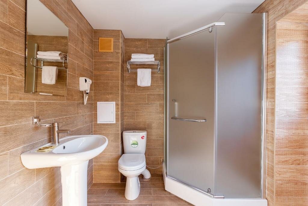 Снимали 2 номера на третьем этаже. В одном были тапочки, во втором нет. Не хватало чайника. И графина для воды питьевой. Куллер только на 1 этаже. По мне так очень мало освещения в номерах