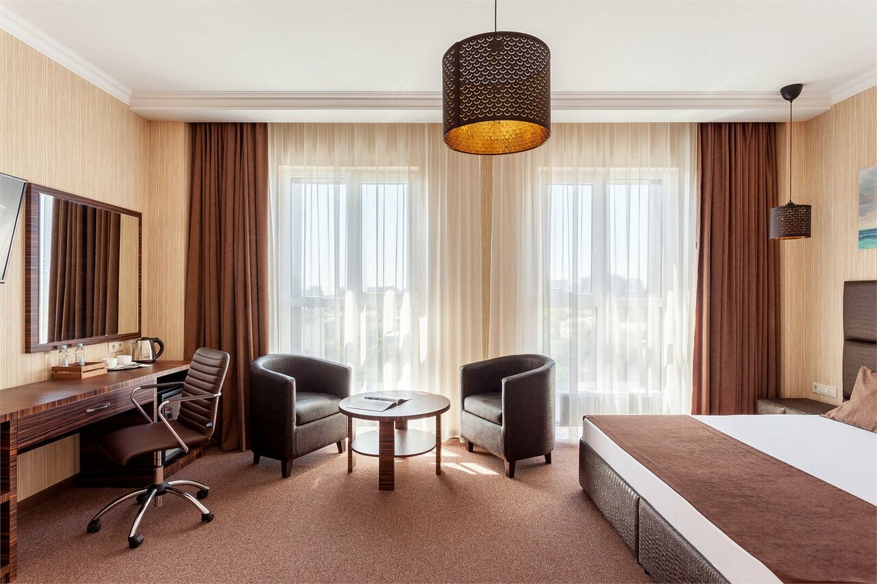 Очень приличный отель. Удобная локация, можно легко добраться в любой район города. Рядом жд и автовокзал. Отъезд в любое время без проблем. Номер просторный, мебель хорошая, но слегка’ подуставшая ‘.Для проживающих предусмотрен завтрак, очень дёшево, но, очень вкусно и сытно. Номер был с окнами на дорогу, поэтому немного шумновато. А в общем отель свои 4звезды отрабатывает полностью. Рекомендую, не пожалеете.