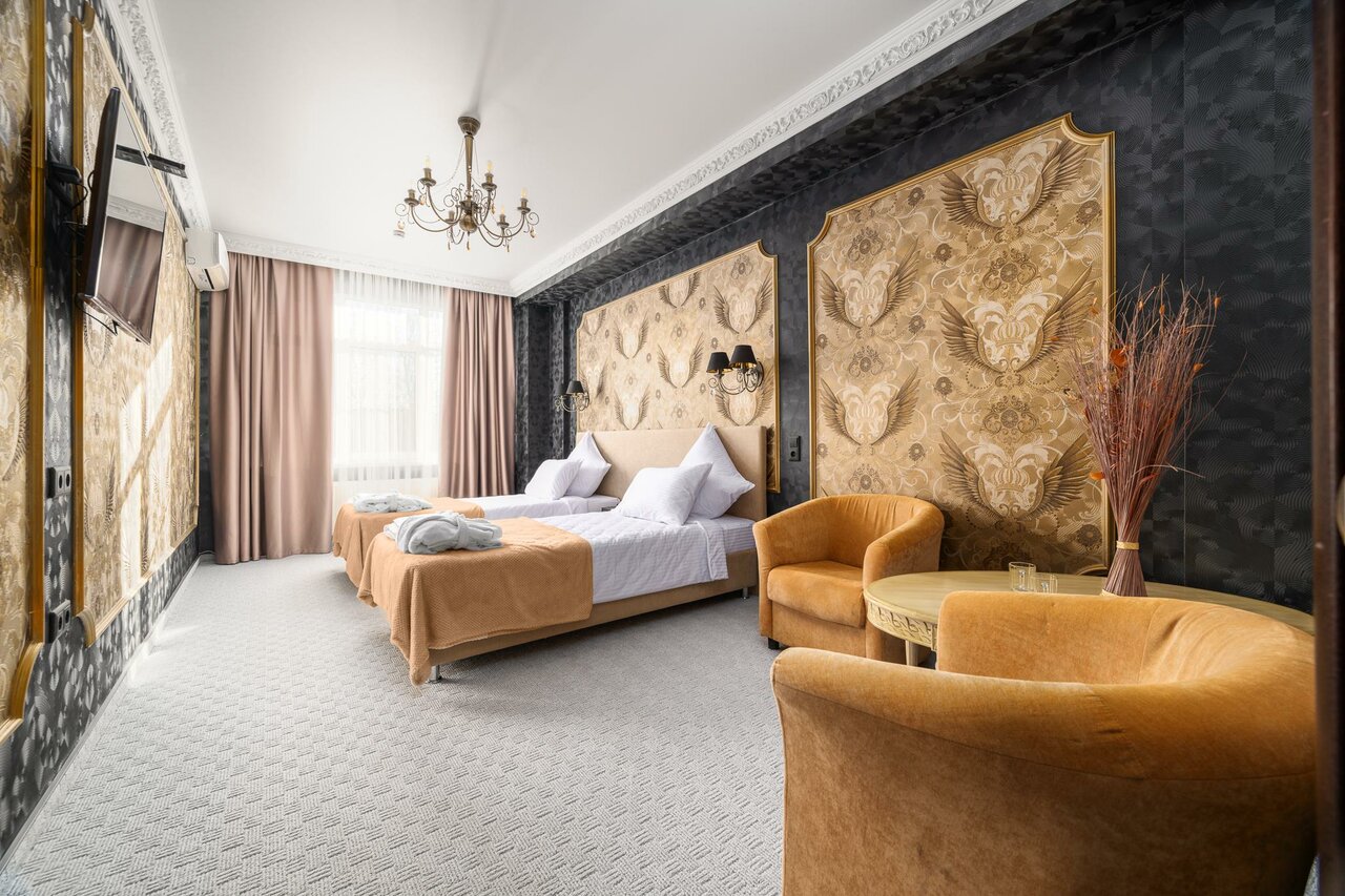 - Красивый интерьер (картины, золотые элементы).