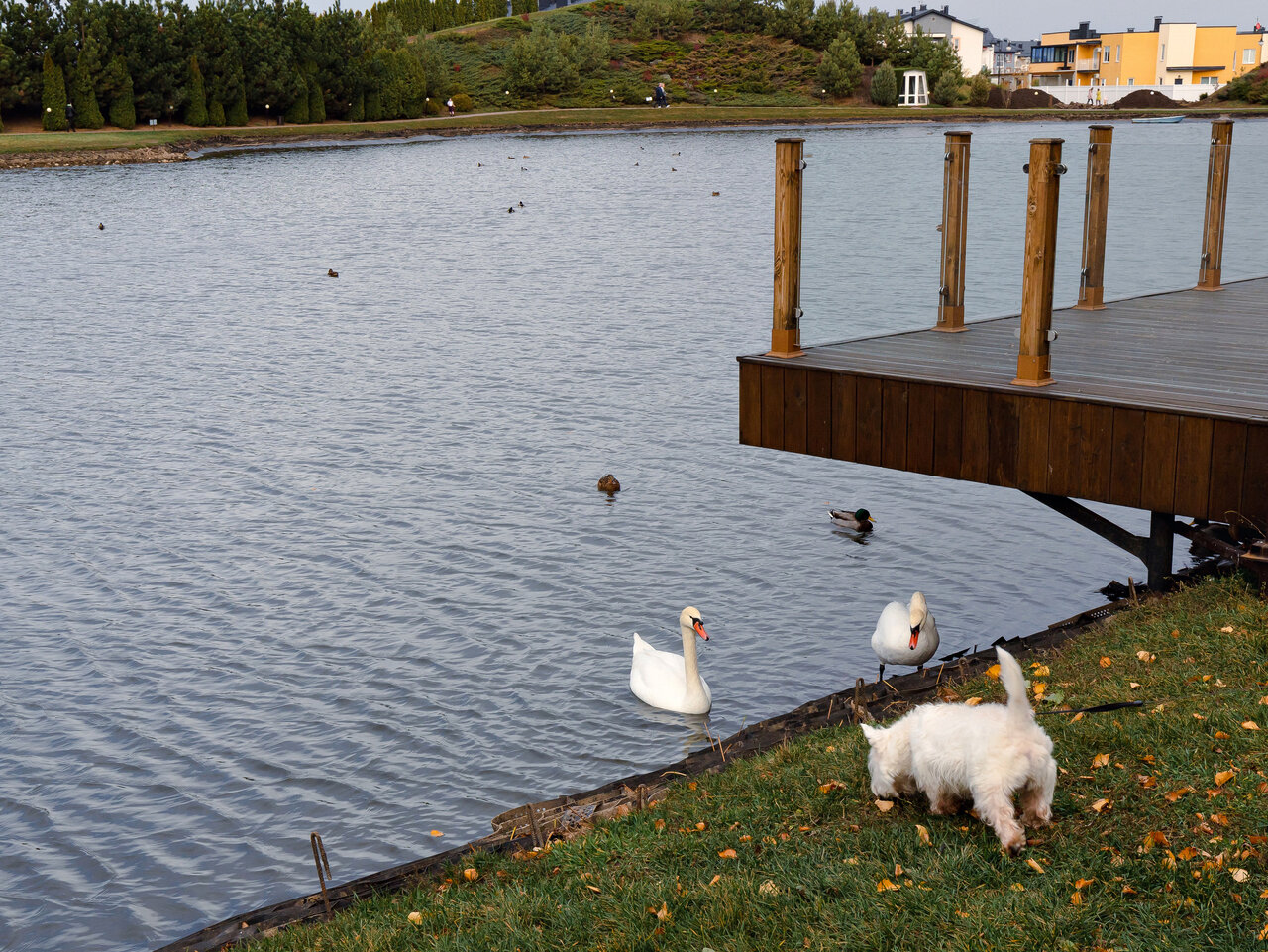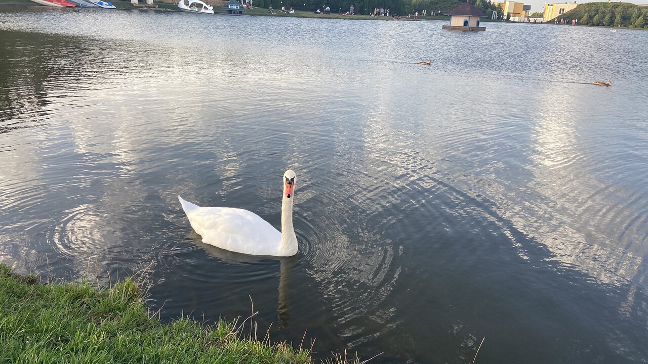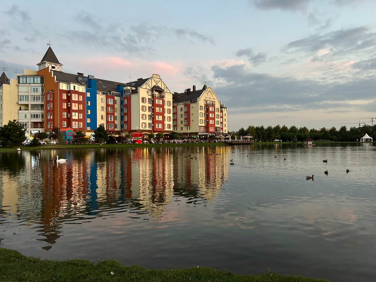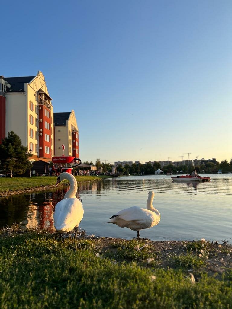 - Красивая территория (озеро, лебеди, утки, зелёная зона).