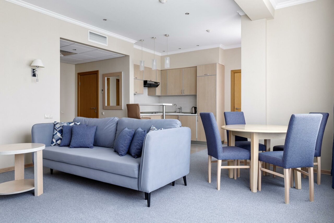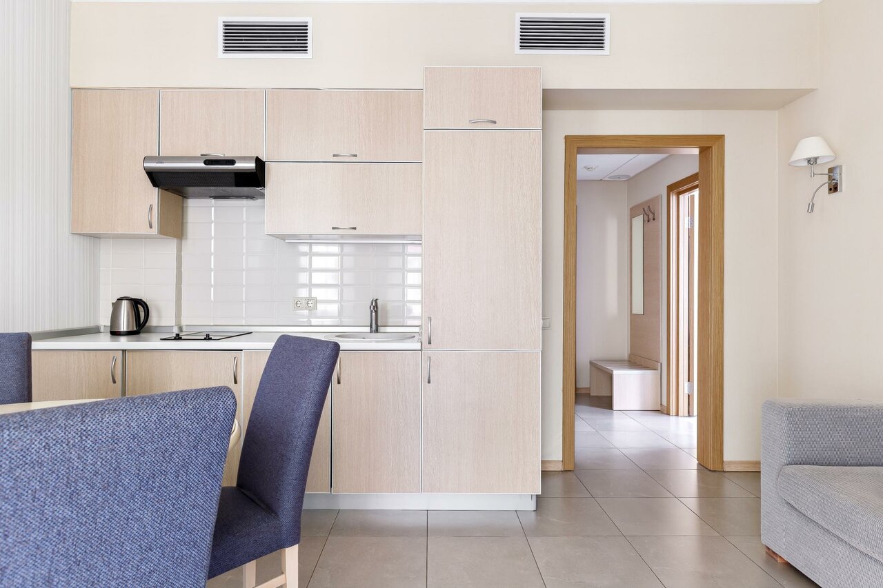Номер идеально подходит для проживания 1-4 гостей. Кухня в номере выделена в отдельную комнату. Площадь номера: 40 кв.м. Большая двуспальная кровать/две односпальных кровати. Индивидуальная уборная с душевой кабиной.