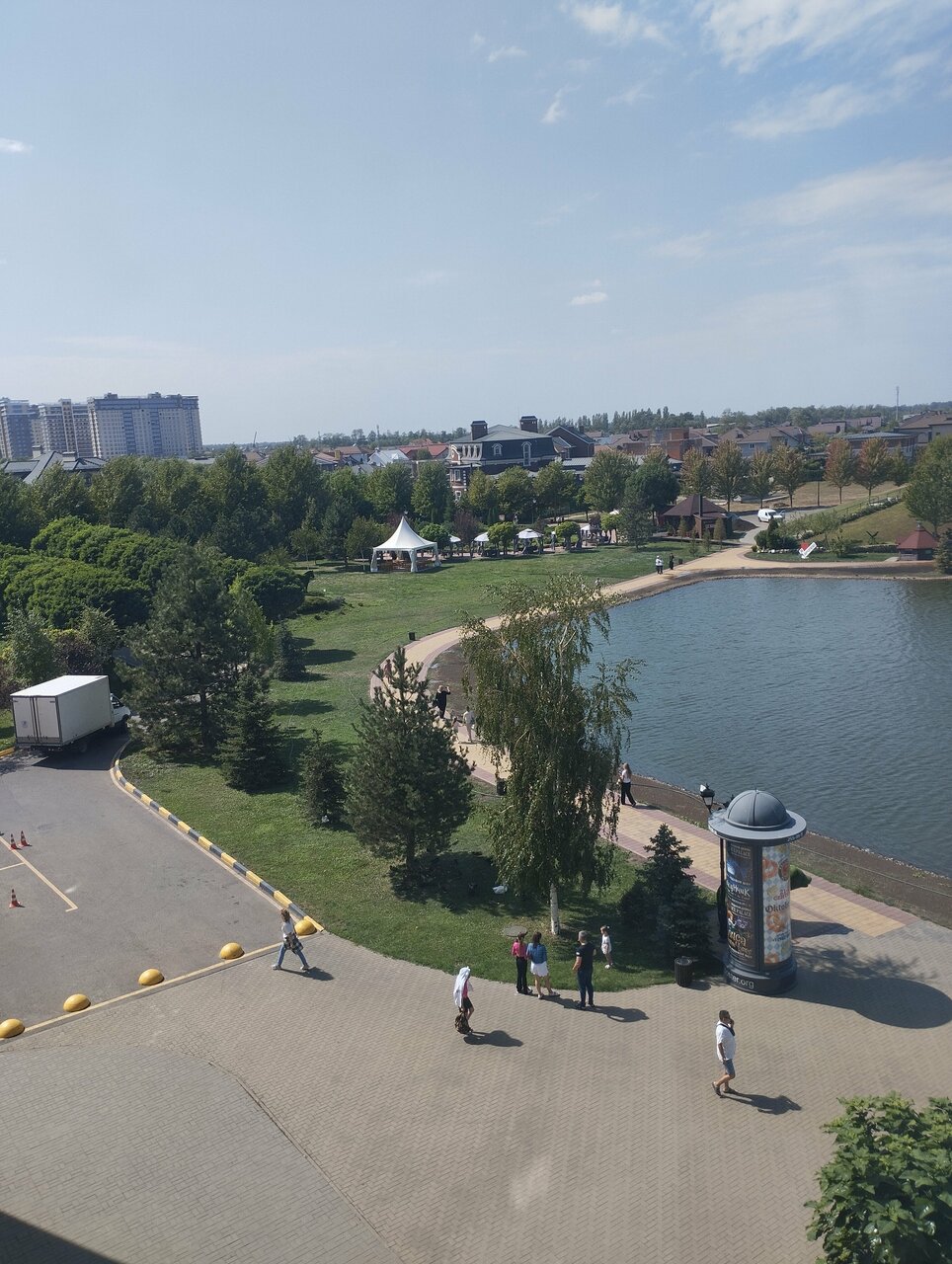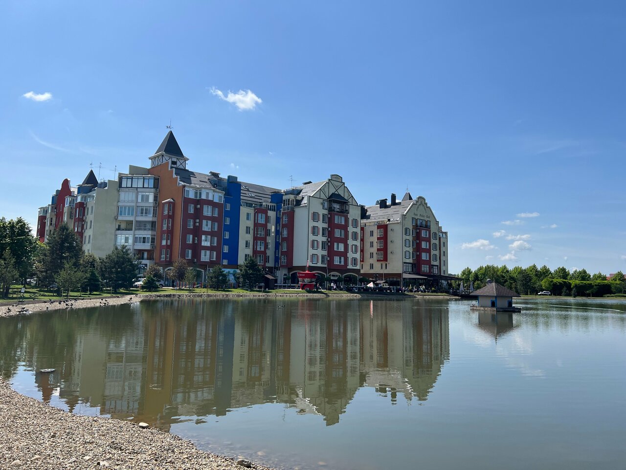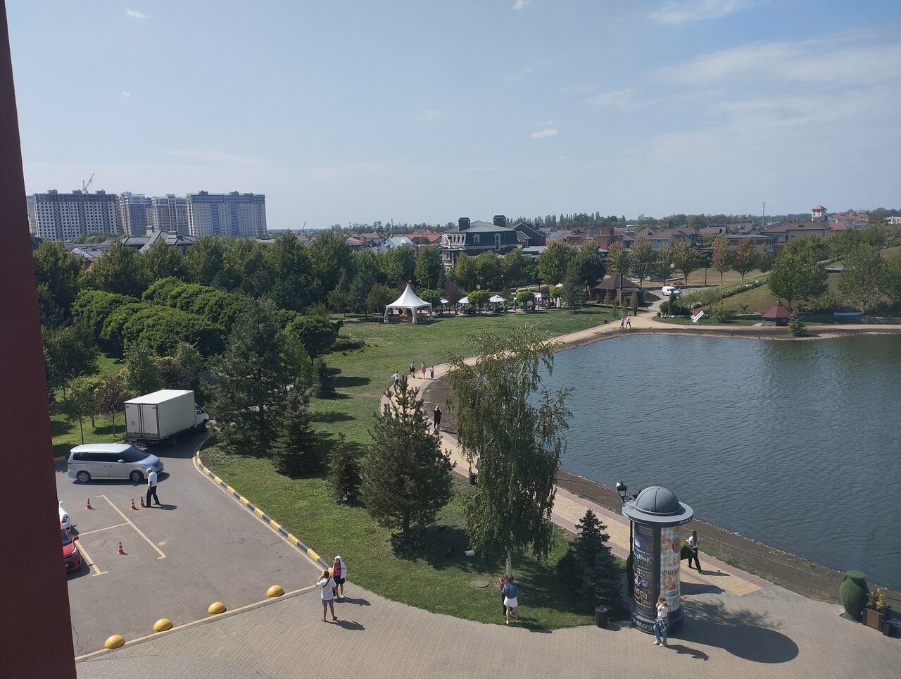 Рекомендую для тех, кто едет в сторону Славянска и ищет приятное место для ночлега. Большая зелёная ухоженная территория, озеро, много разных птиц — очень мило для утренней и вечерней прогулки. В шаговой доступности несколько продуктовых магазинов. На первом этаже отеля пивной ресторан и несколько заведений поблизости. Парковки на территории хватает. Сам отель уже пошарпался, но без отторжения. Несколько раз останавливался и остался в целом доволен. Из неудобного — завтрак только с 9 утра и выезд с локации в часы пик, особенно в сторону города. До центра Краснодара очень далеко, но зато удобно встать на Обход и поехать к морю.