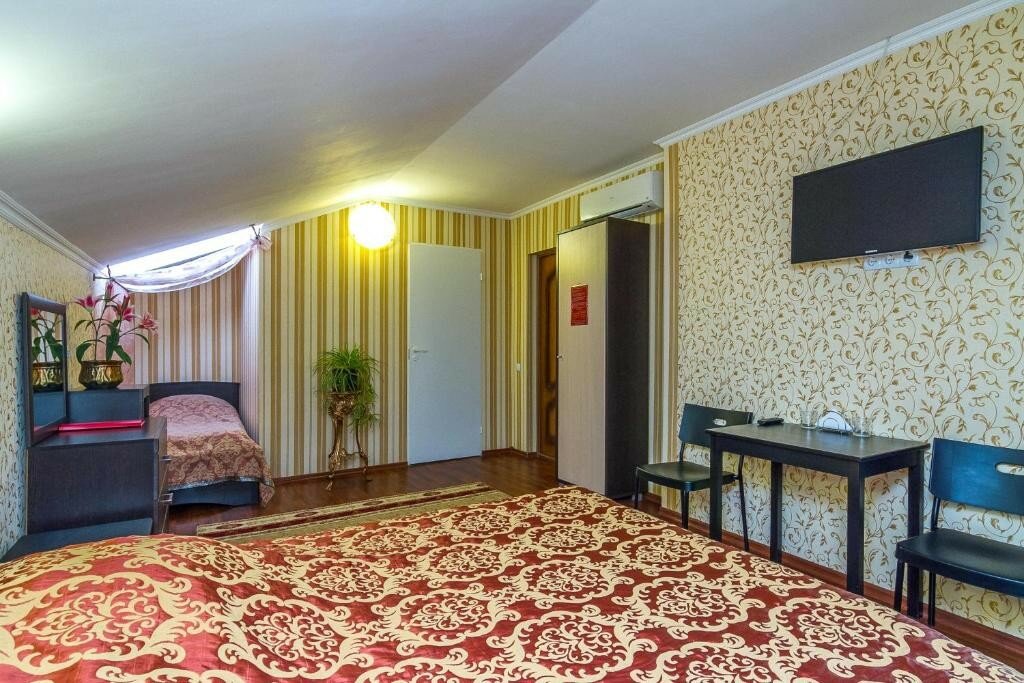 Сняли на ночь перед тем как доехать до моря. Это конечно ужас. По приезду сначала показалось все хорошо, когда заехали семьёй с одним ребенком минусов куча. В номерх нет разовых шампуни и геля для душа с мылом, стоит грязный стакан для зубных щеток и пасты. Так же, в туалете просто грязный унитаз, полотенце в ногах 3-х 2 шт, одно большое втрое среднее, дочь нашла под кроватями бутылки от прежних гостей, видимо не убирают вообще, пыли куча под кроватью. Когда легли спать увидела,что постельное белье собрано видимо из того,что было, пододеяльник от другого комплекта, но когда я приложила лицом к подушке она вся пахла потом предыдущих гостей. Вообщем вывод такой за 3-х местный номер 3300 тысячи за ночь не стоит. И это как будто обычный жилой дом и в нем сделали куча комнат, и долго от М4 ехать в город не в центре, как будто в деревне