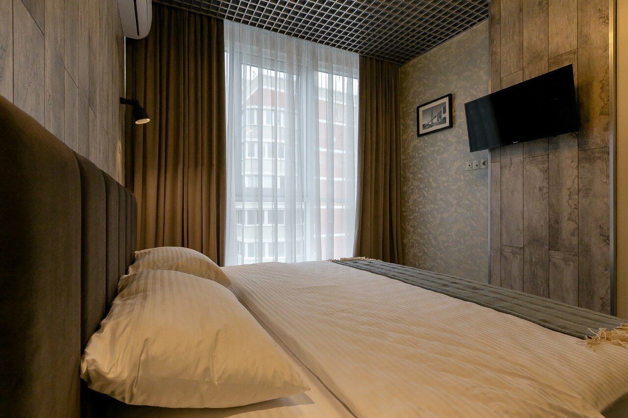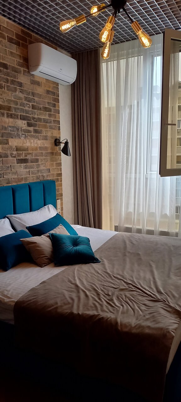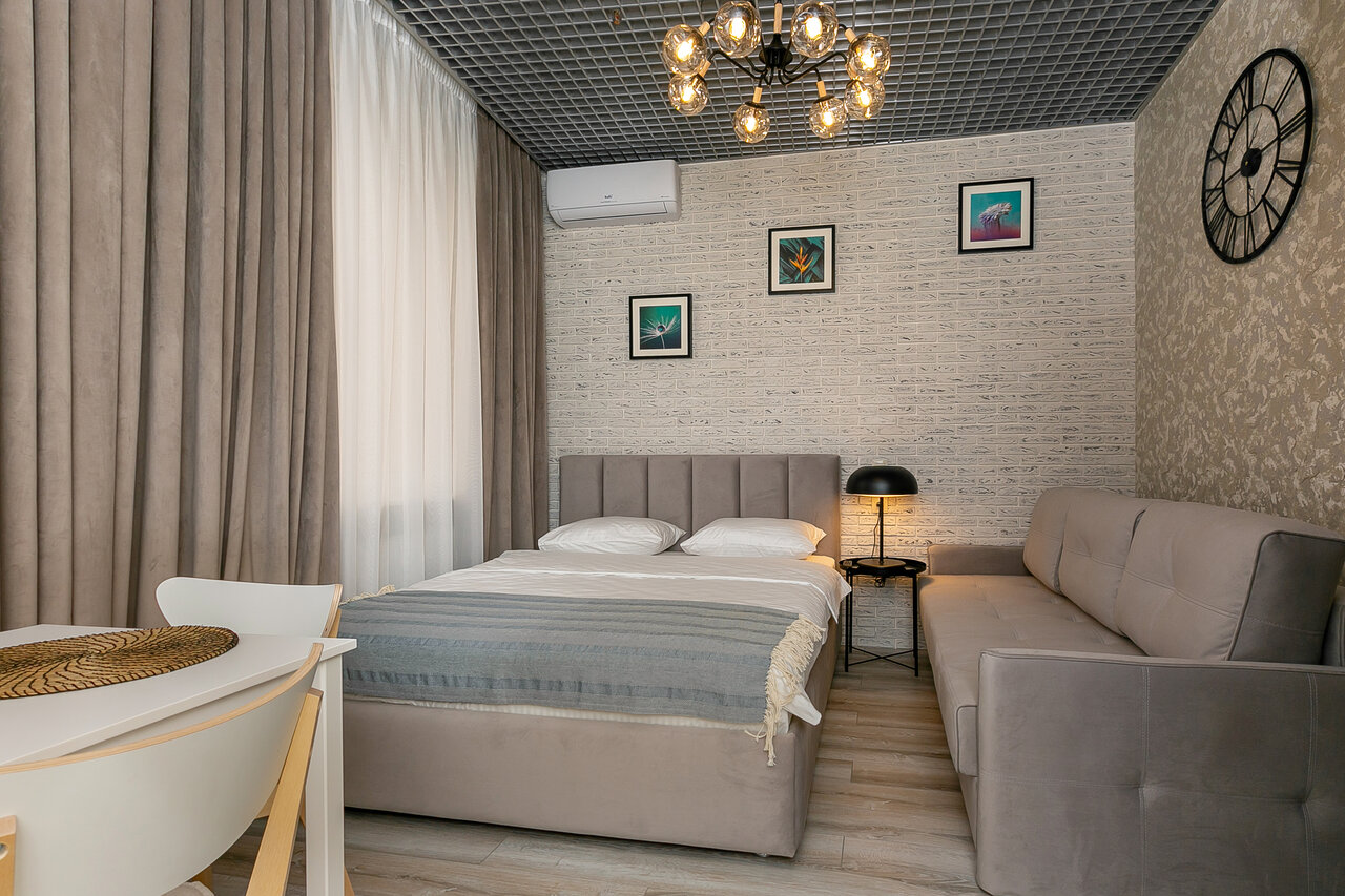 К услугам гостей стильные апартаменты Делюкс общей площадью 33 м2 с дизайнерским ремонтом, красивым панорамным видом на центр города с 11 этажа, и всем необходимым для уютного проживания.
