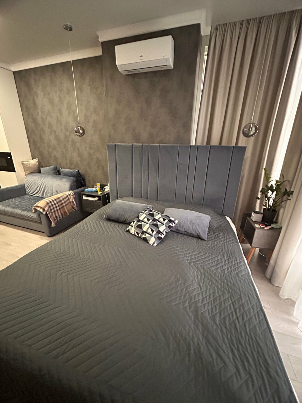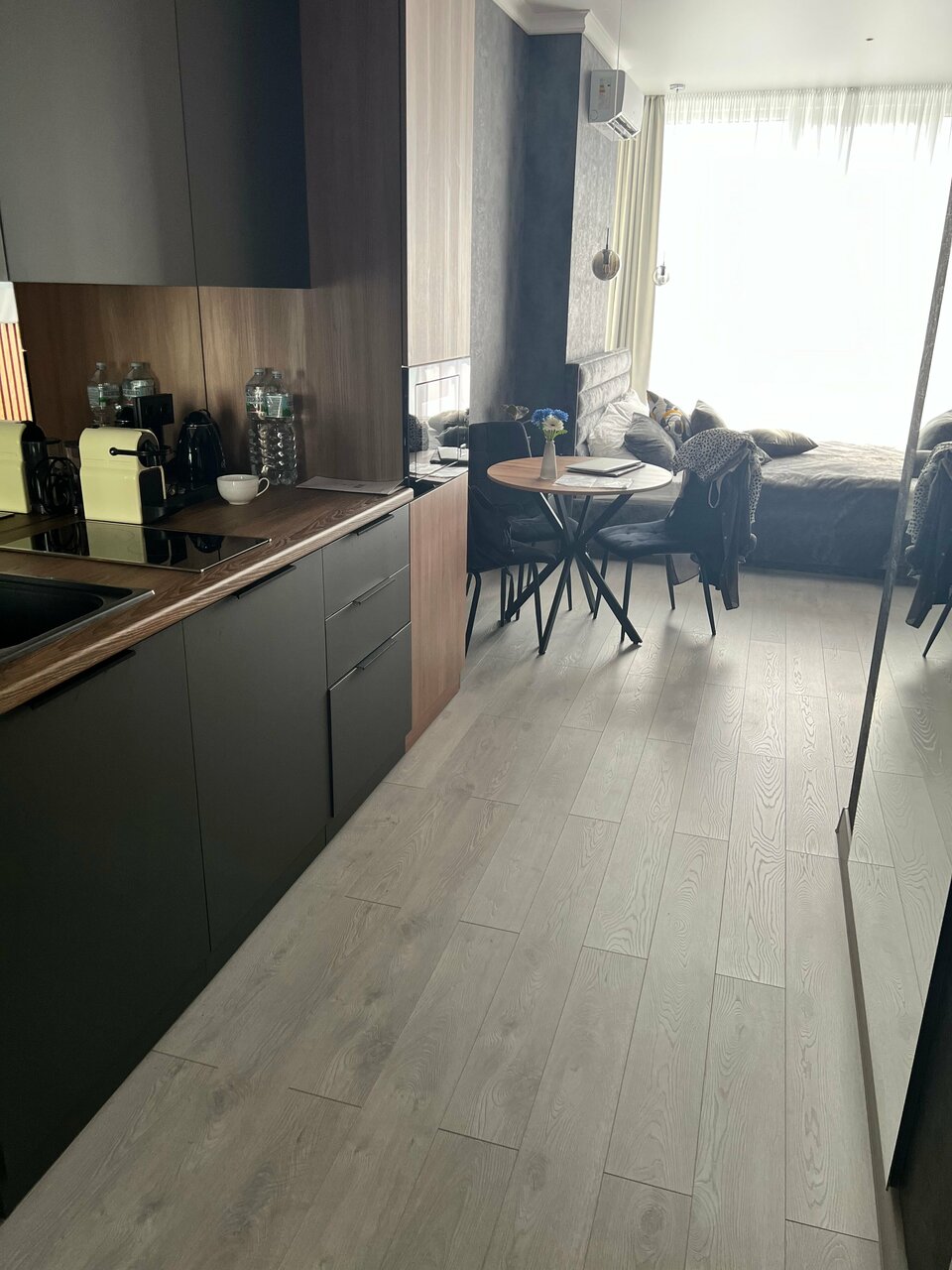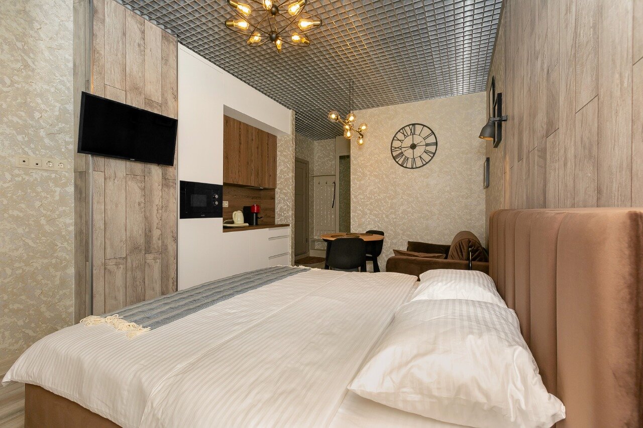 К услугам гостей стильные апартаменты Делюкс общей площадью 33м2 с дизайнерским ремонтом, красивым панорамным видом на центр города с 11 этажа, и всем необходимым для уютного проживания.