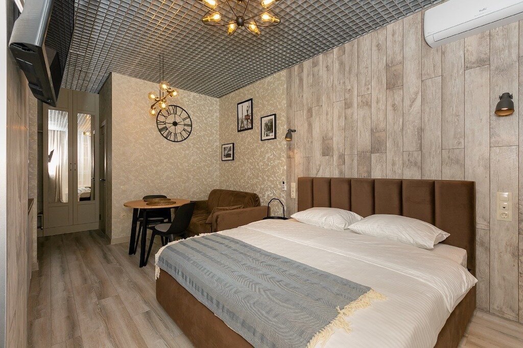 Аренда апартаментов премиум класса при 2хместном размещении.К услугам гостей:- широкая двуспальная кровать, ортопедический матрас- раскладной диван,- TV, бесплатный Wi-fi,- миникухня, кофемашина- душевая комнатаПринадлежности для кухни, душа.