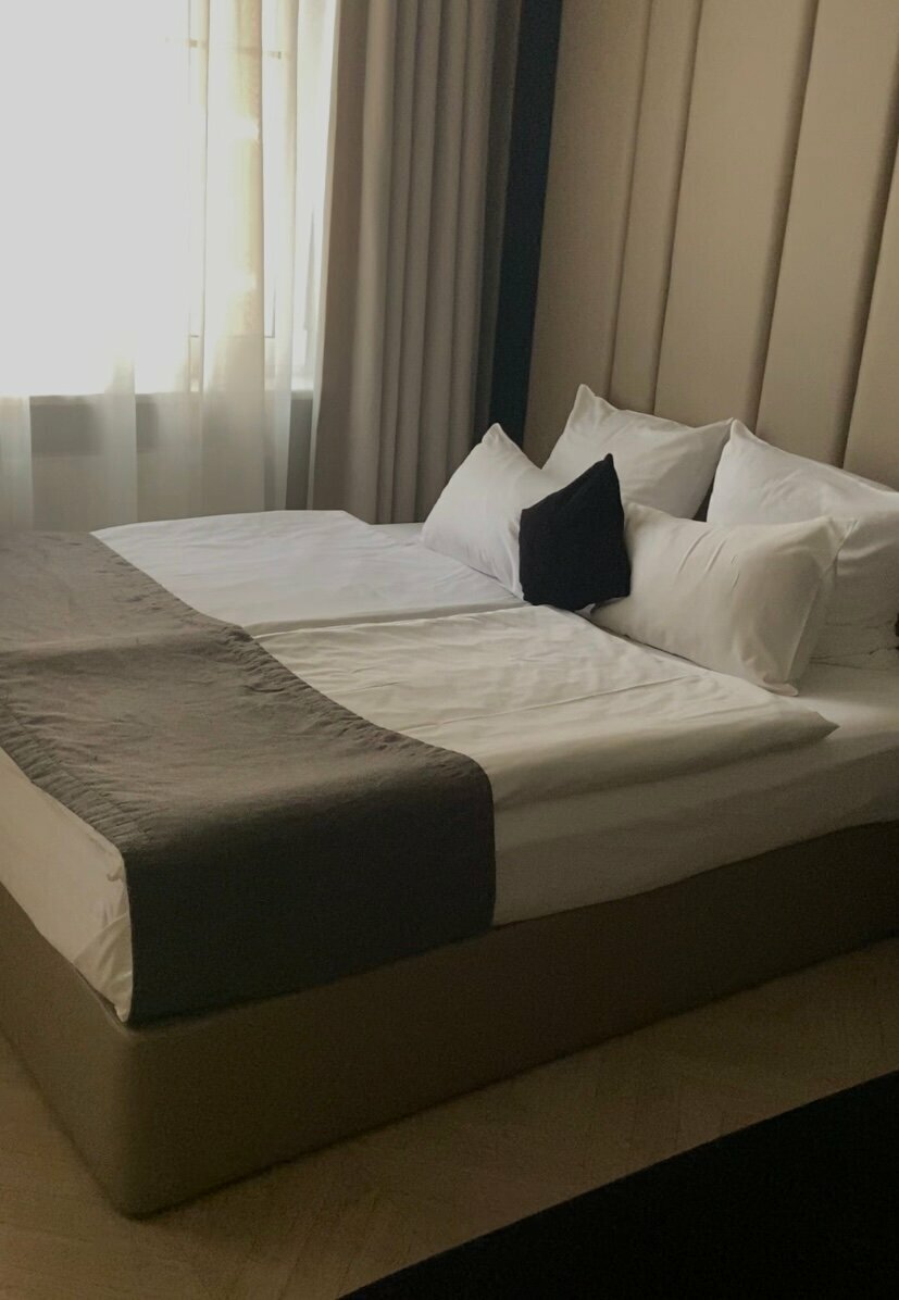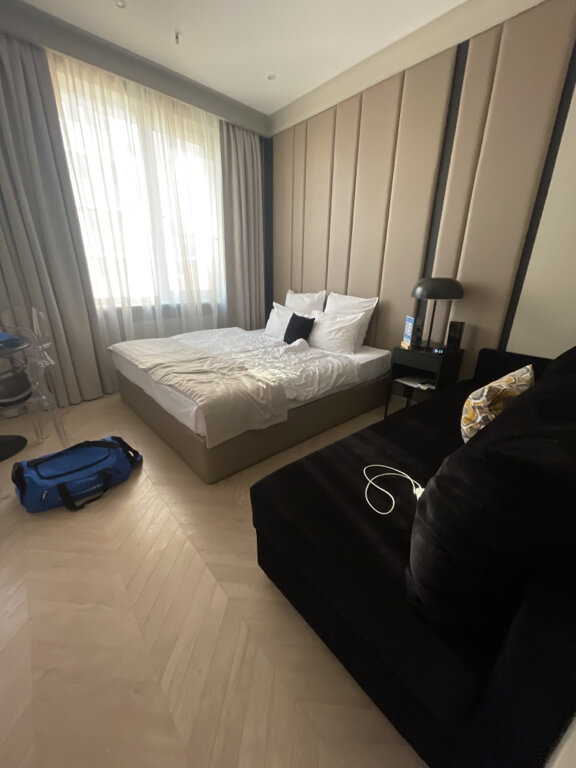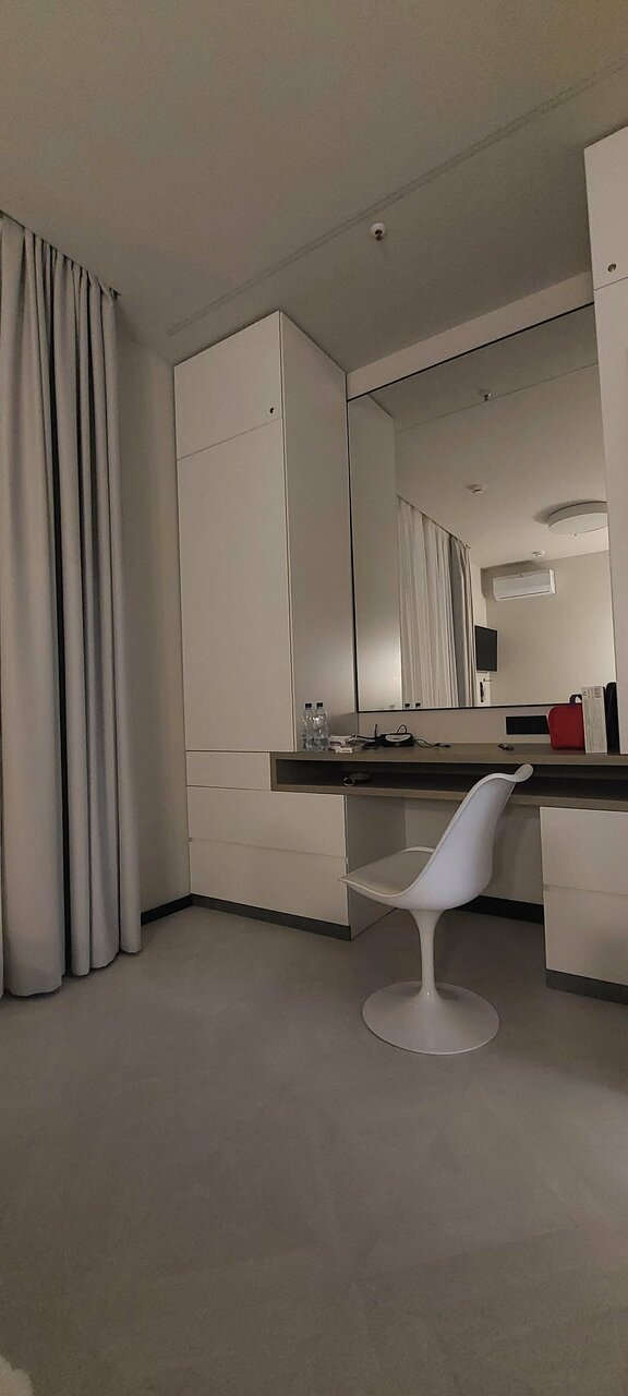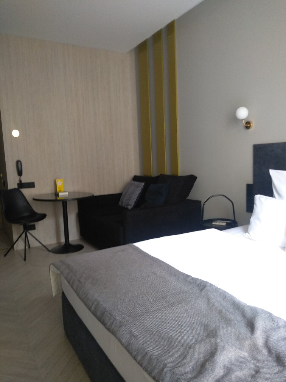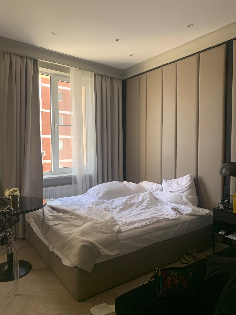 Очень приятный интерьер, видна работа с дизайнером. Оснащение номера тоже на высоте, особенно тест-драйв Алисы — продали её нам лучше, чем любые промокоды и акции. Расположение отеля также порадовало, все необходимое в относительной близости. Также хотелось бы отметить чистоту номера — во многих других отелях даже близко не так убрано. В номере есть капсульная кофе-машина с парой капсул к ней и две бутылки питьевой воды, что очень удобно на утро. В ванной есть бритвенный набор, шампунь, гель для душа и кондиционер для волос. Из минусов — неудобные подушки, которые не держат шею и небольшой казус с фасадным окном, который решили мы сами за 5 минут с помощью капли физической силы.