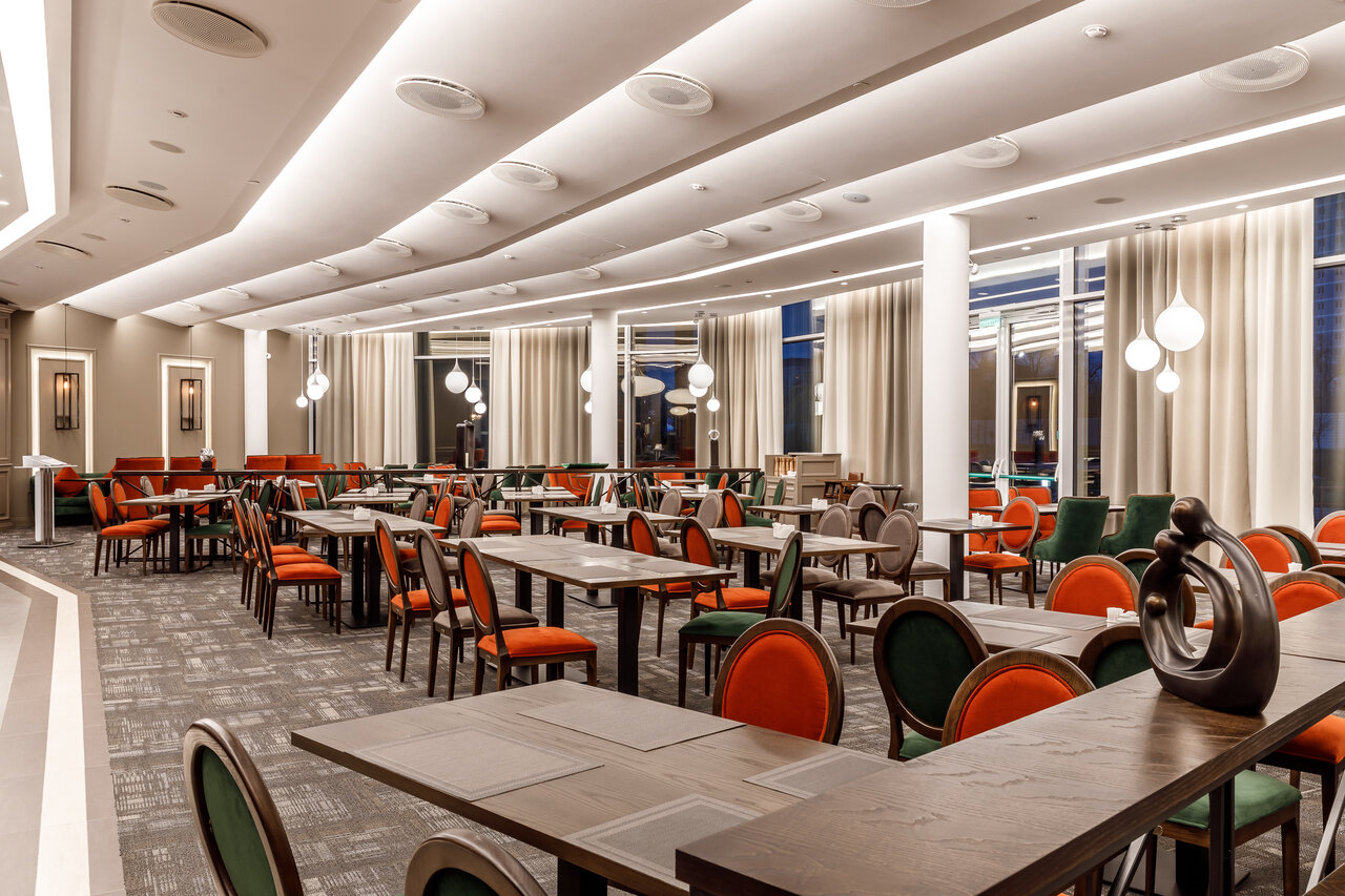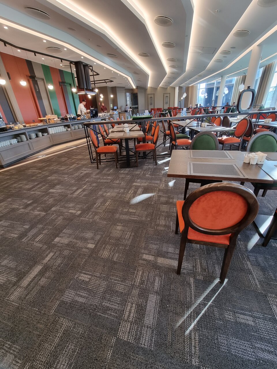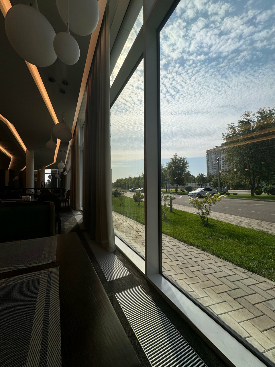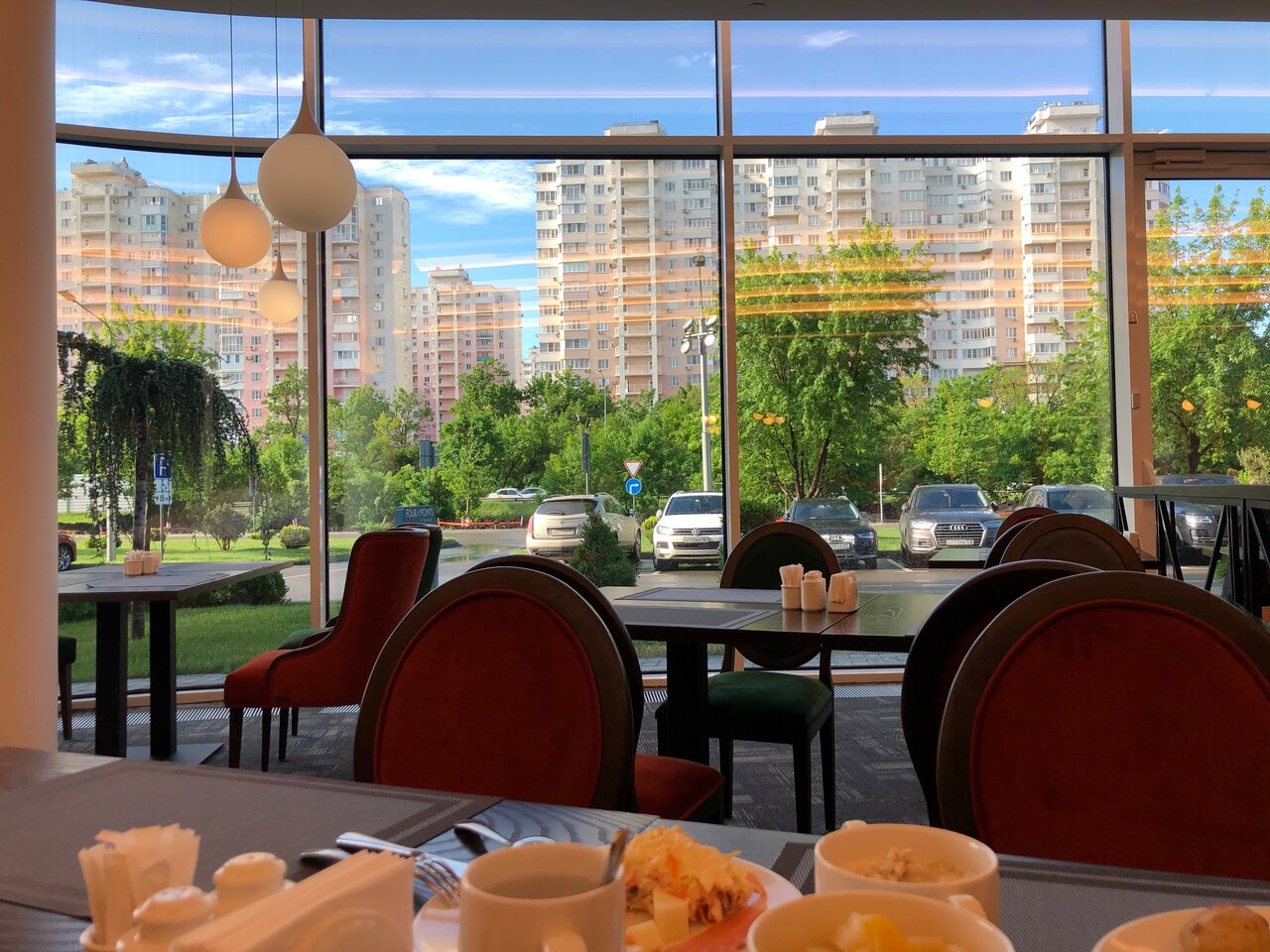 Расположен прям возле выстовочного комплекса. Посещали ресторан отеля. Из положительного: Большое помещение и много места для гостей. Чистое и светлое помещение. Из отрицательного: Очень дорого . За стейк 400 г. отдали 8000 руб. При посещении с женой в тарелке нашла волос.
