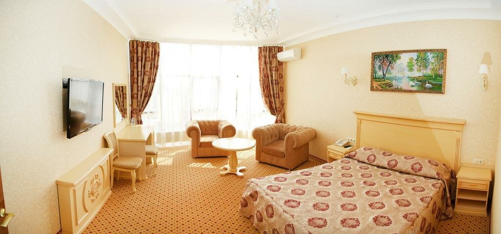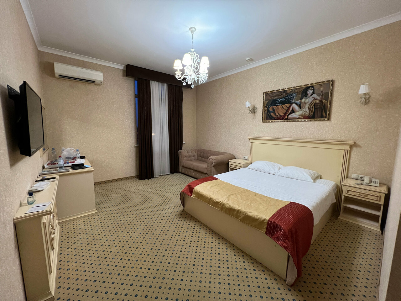 Двухкомнатный номер категории 'Люкс' с гидромассажной ванной. А сосредоточиться на работе вам поможет выделенная рабочая зона с удобным столом и бесплатным WI-FI.