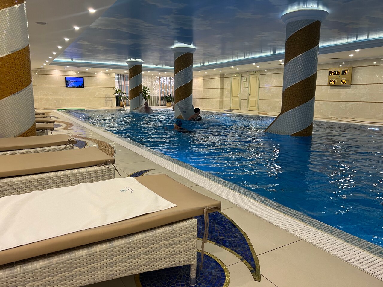 Хороший отель, приемлимые цены за оказываемые услуги. Бассейн, баня, хамам уже входят в стоимость номера (там обвлденно). А вот на массаж сходить не удалось, там нужна запись В общем — все супер. Единственное, что мне не очень понравилось- это ковры-паласы, в номерах и коридорах. Они конечно чистые, но все же.