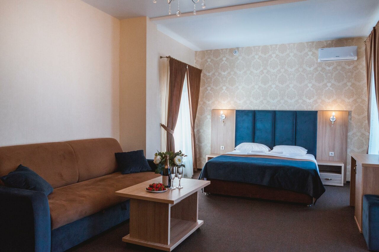 Останавливались на 1 ночь с семьёй в большом номере (удобный диван как доп место). Из плюсов: В номере чайник, стаканы, тапочки, халаты, мыло, зубной набор (ничего не пришлось доставать из чемодана). Есть парковочные места на городской платной парковке (с 8.00 до 20.00) рядом с отелем. Из минусов: wi-fi плоховат(((