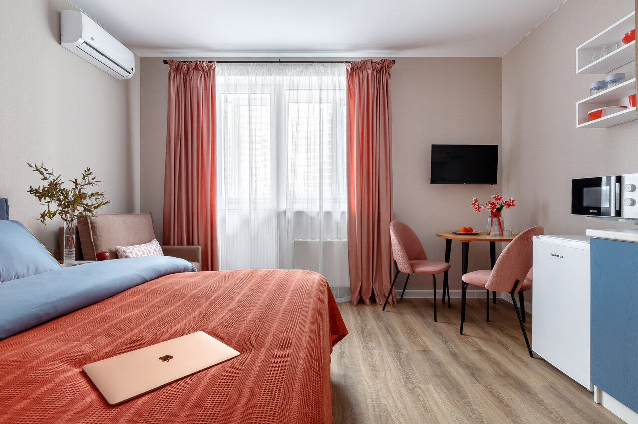 Очень удобный формат гостиницы. Чистая комната, ванна, кухня со всеми принадлежностями. Удобная комфортная кровать. Советую!!!