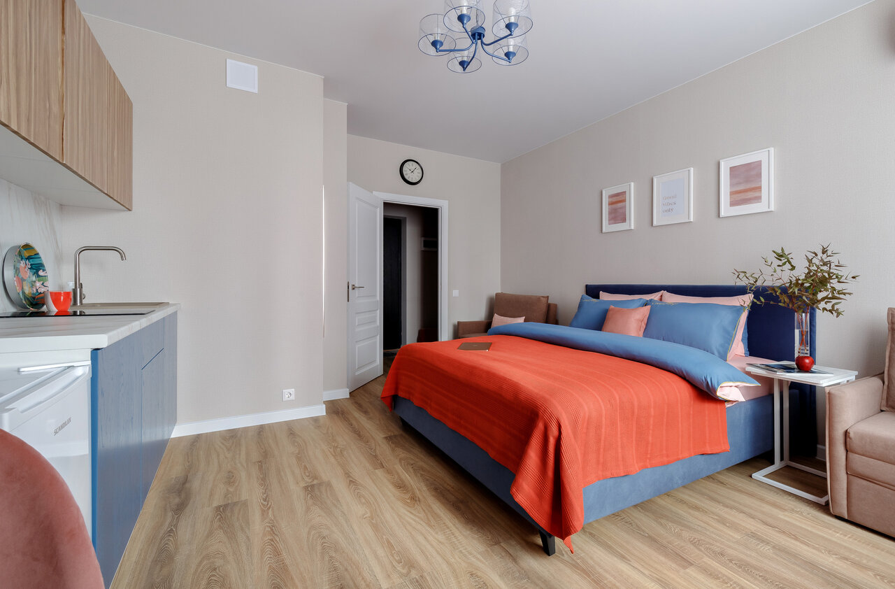 - Теплые полы и комфортная температура в квартире.; Наличие дополнительных удобств (чай, кофе, кофемашина, мыльные принадлежности).; Удобное бесконтактное заселение.; Уютная и приятная атмосфера.; Продуманные мелочи для гостей.