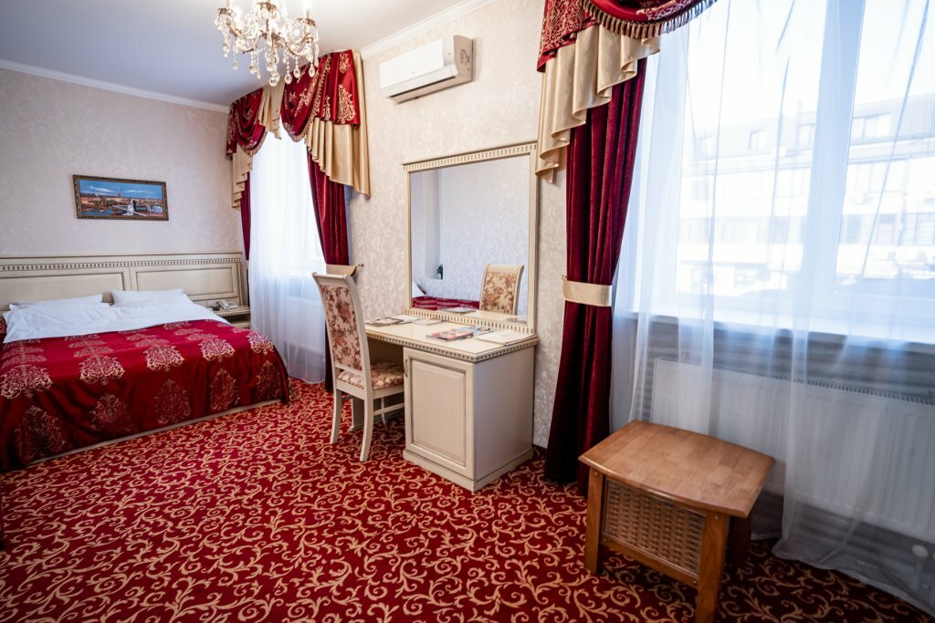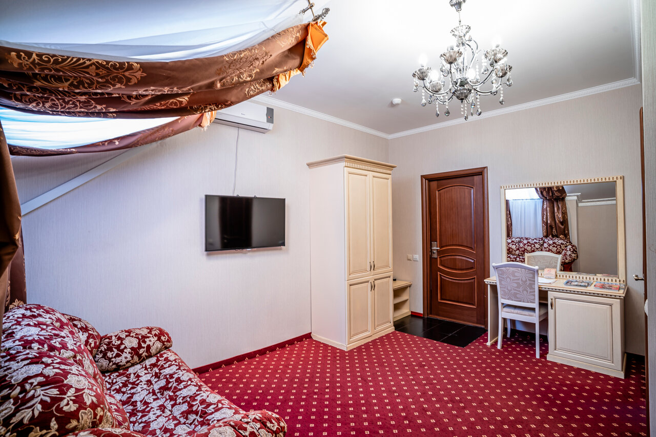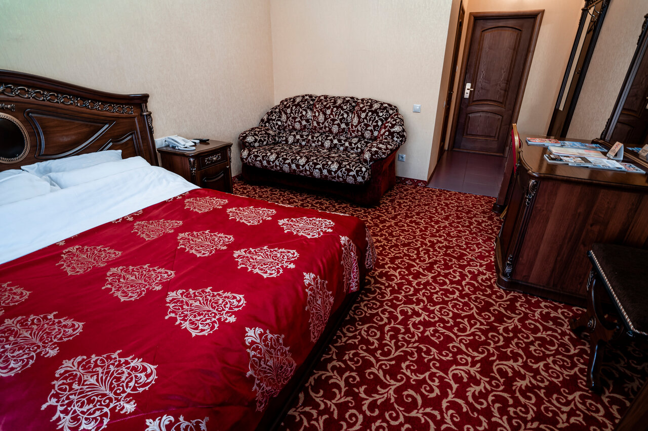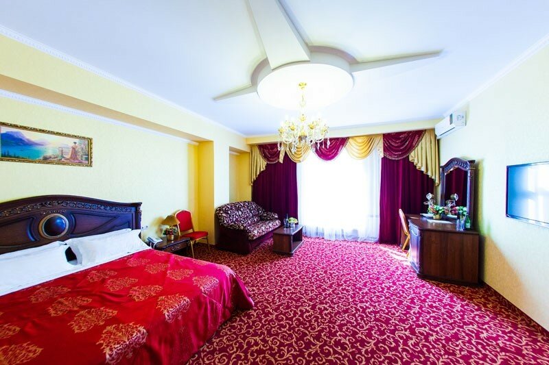Удобства: — Номера (от 2000 до 5000 ₽/ночь) с кондиционером, Wi-Fi, холодильником, санузлом. — Два бассейна (крытый, подогреваемый), тренажёрный зал, SPA, сауна, хаммам, джакузи. — Ресторан, кафе, бар у бассейна, детское меню. — Парковка (бесплатно), трансфер (аэропорт/вокзал), прокат велосипедов и авто. — Для детей: игровая комната, площадка, стульчики. — Оздоровительные услуги: массаж, салон красоты, солярий.