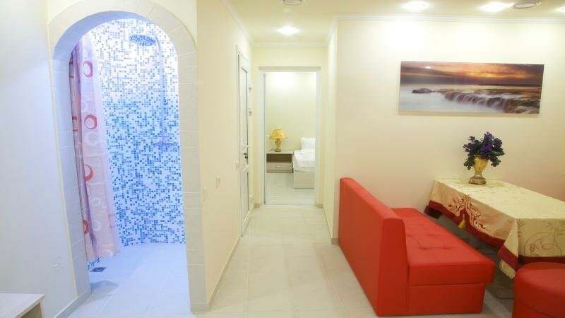 1) очень удобное расположение для людей которые едут к морю (можно отдохнуть ) 2) очень уютное местечко 3) номера чистые, белье белоснежное, в номере есть все что необходимо, холодильник, фен телевизор , мыло, гель , полотенце Если вам необходима посуда все предоставят. Мне понравилось приеду ещё