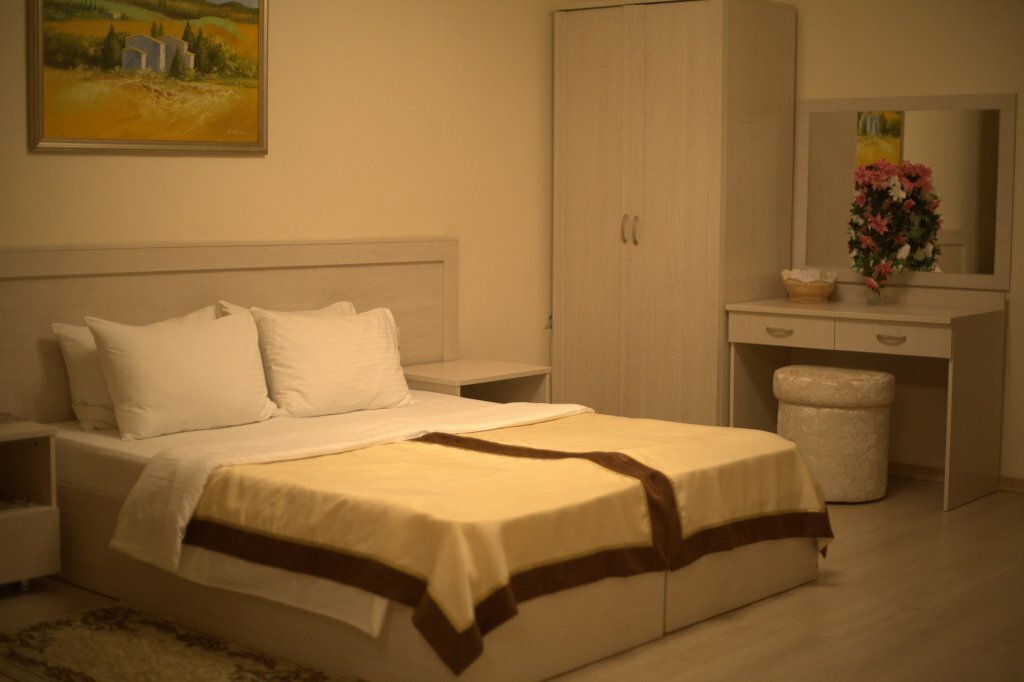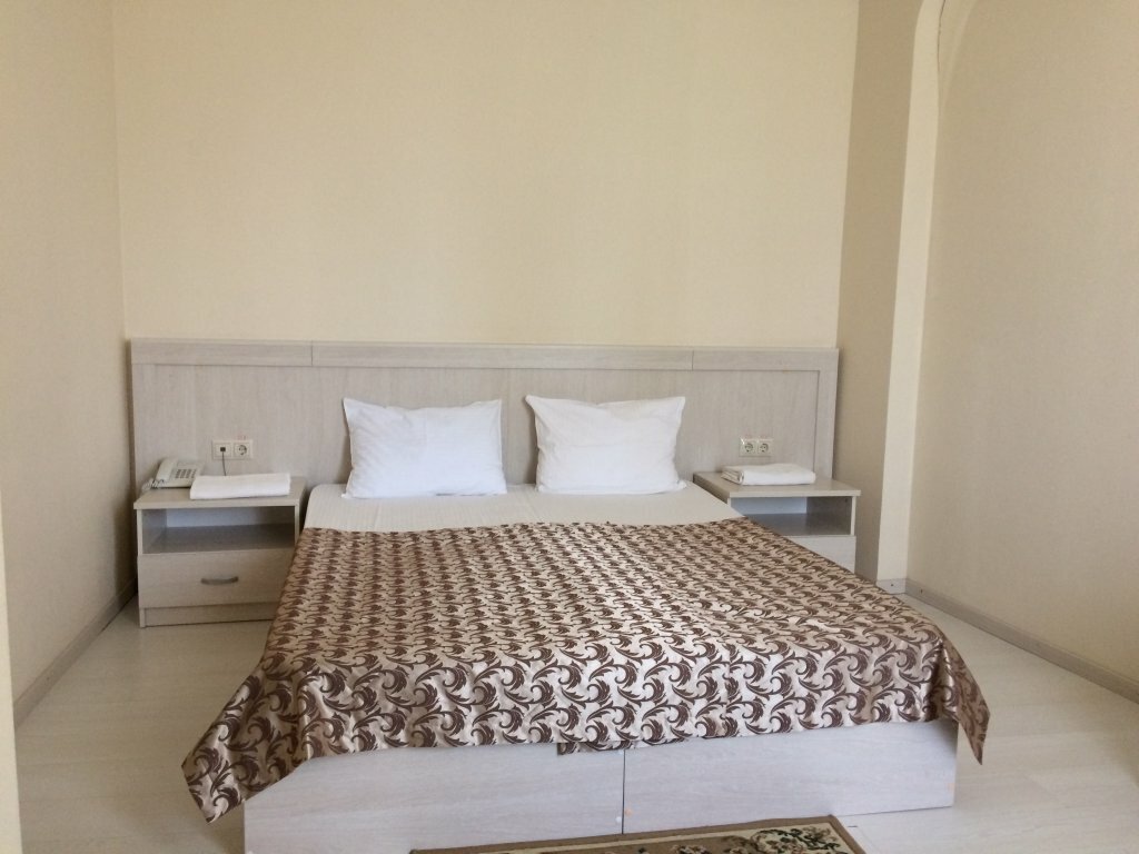 Номер с большой двуспальной кроватью, телефон, санузел , душевая кабинка, холодильник, телевизор, ванной комнатой, оснащённой феном и туалет -космечискими приднадлежностями , так же можно заказать блюдо в номер.
