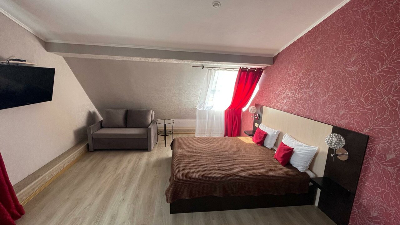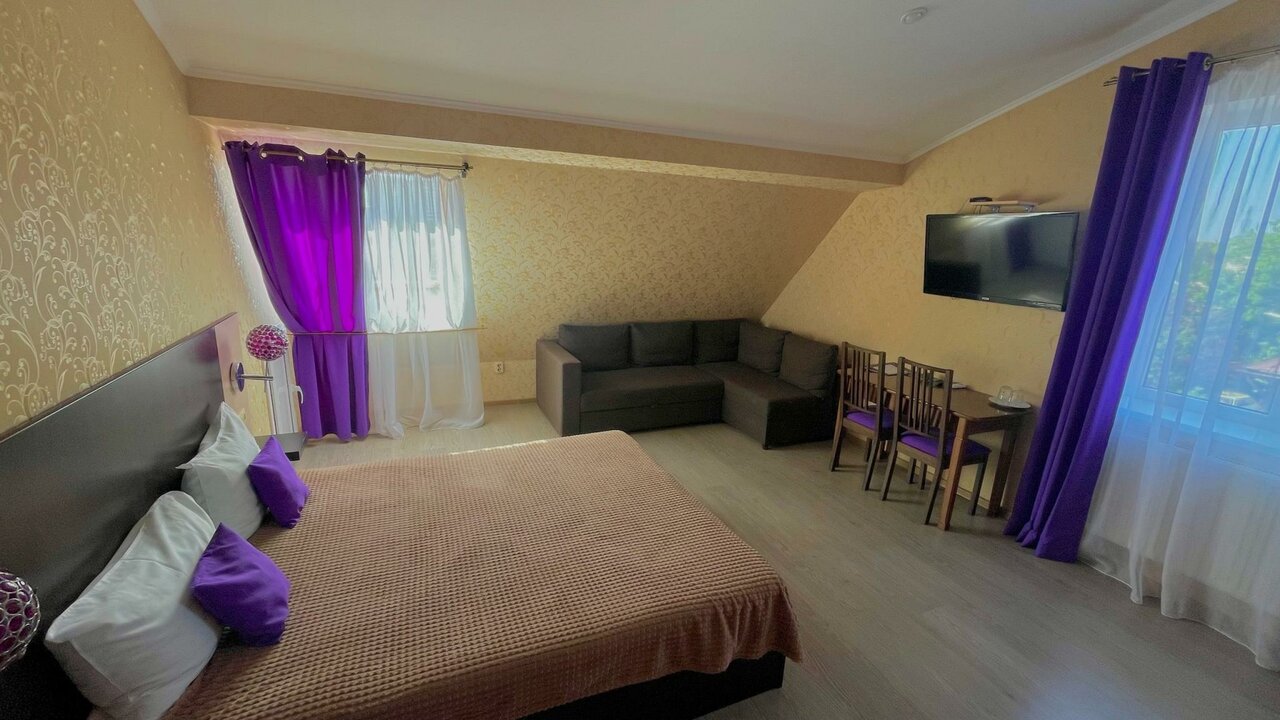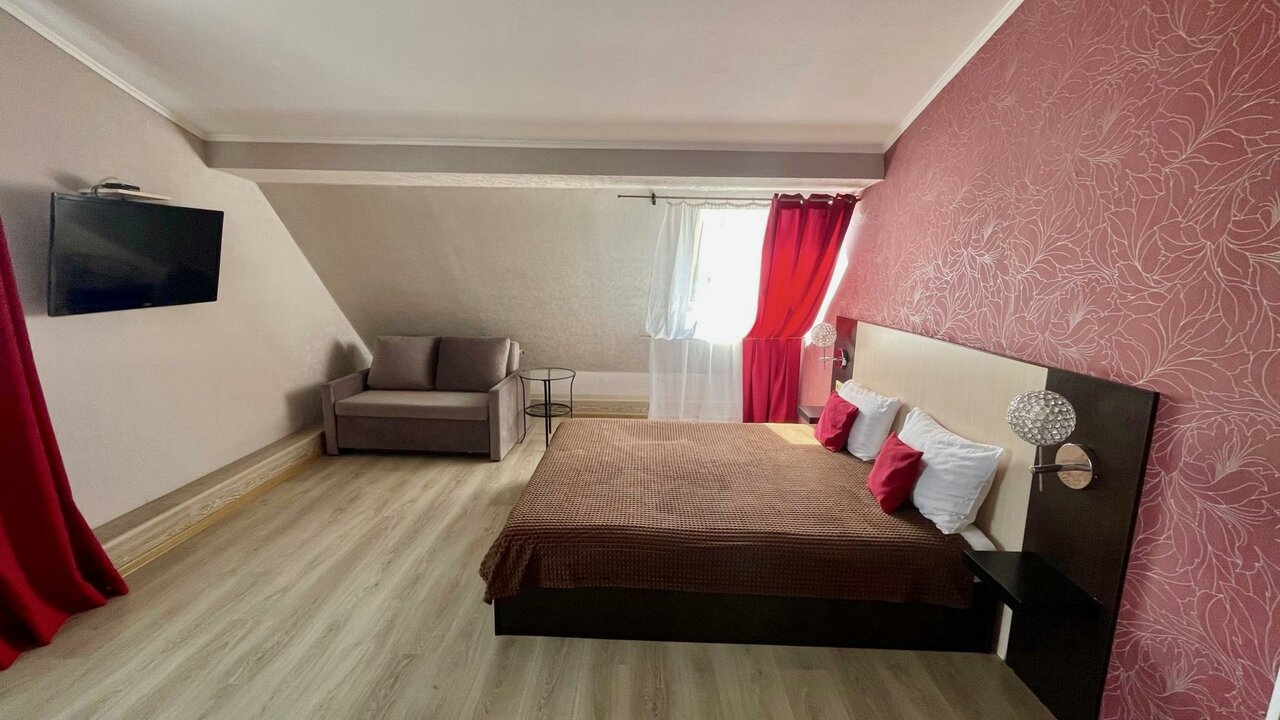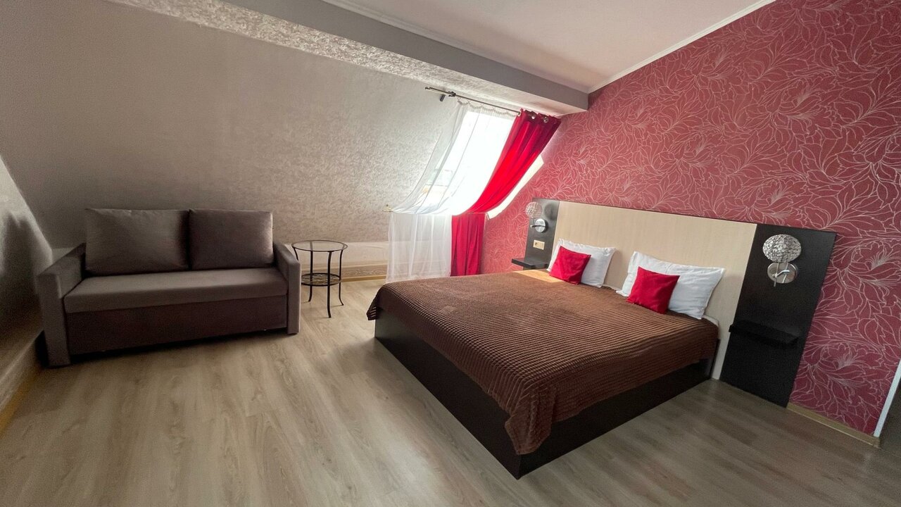 Комфортный номер с широкой двуспальной кроватью и дополнительным спальным местом-диваном.