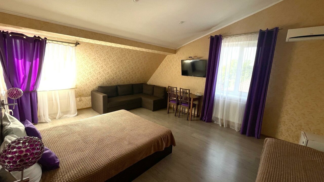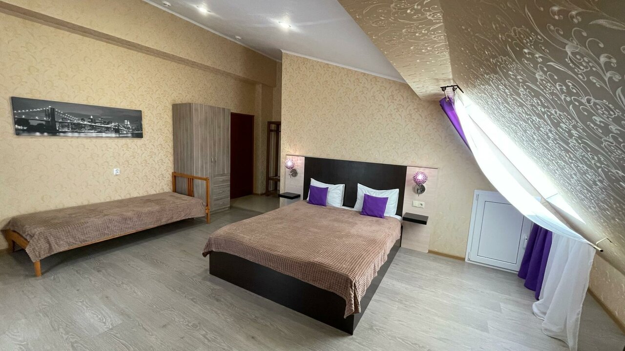 Номер 'Семейный' с двухспальной кроватью, большим угловым диваном и односпальной кроватью. Номер рассчитан для комфортного проживания 5 гостей.