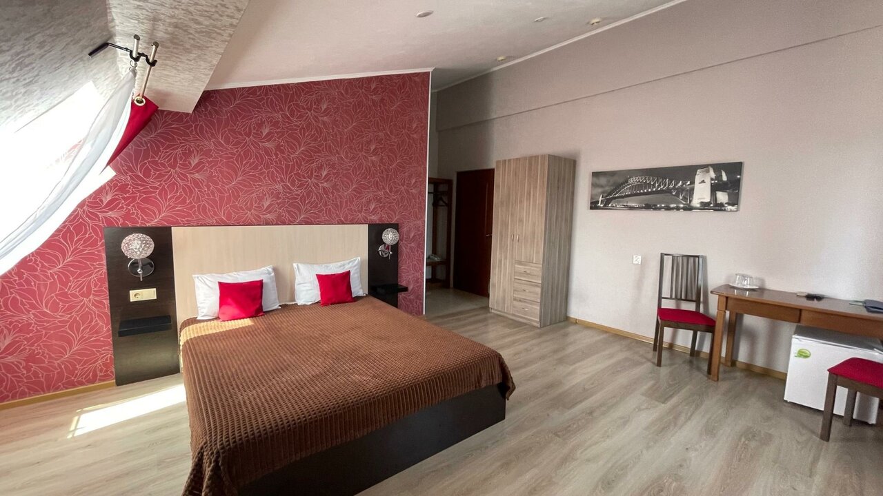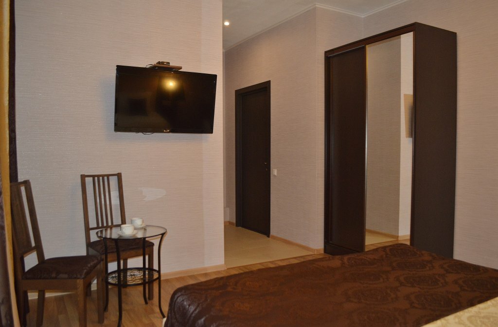 В номере есть все необходимое для комфортного проживания : двуспальная кровать (160х200), душевая комната, оснащенная всем необходимым, туалетная косметика, тапочки, кондиционер, телевизор, холодильник
